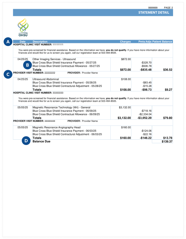 An image of page 2 of a sample OHSU bill: the statement detail. A table shows the date, description, charges, payments/adjustments, and amount due for each visit. Four areas are highlighted: date of service, description, the section headers within the table that show the hospital or provider who is billing for the service, and balance due.