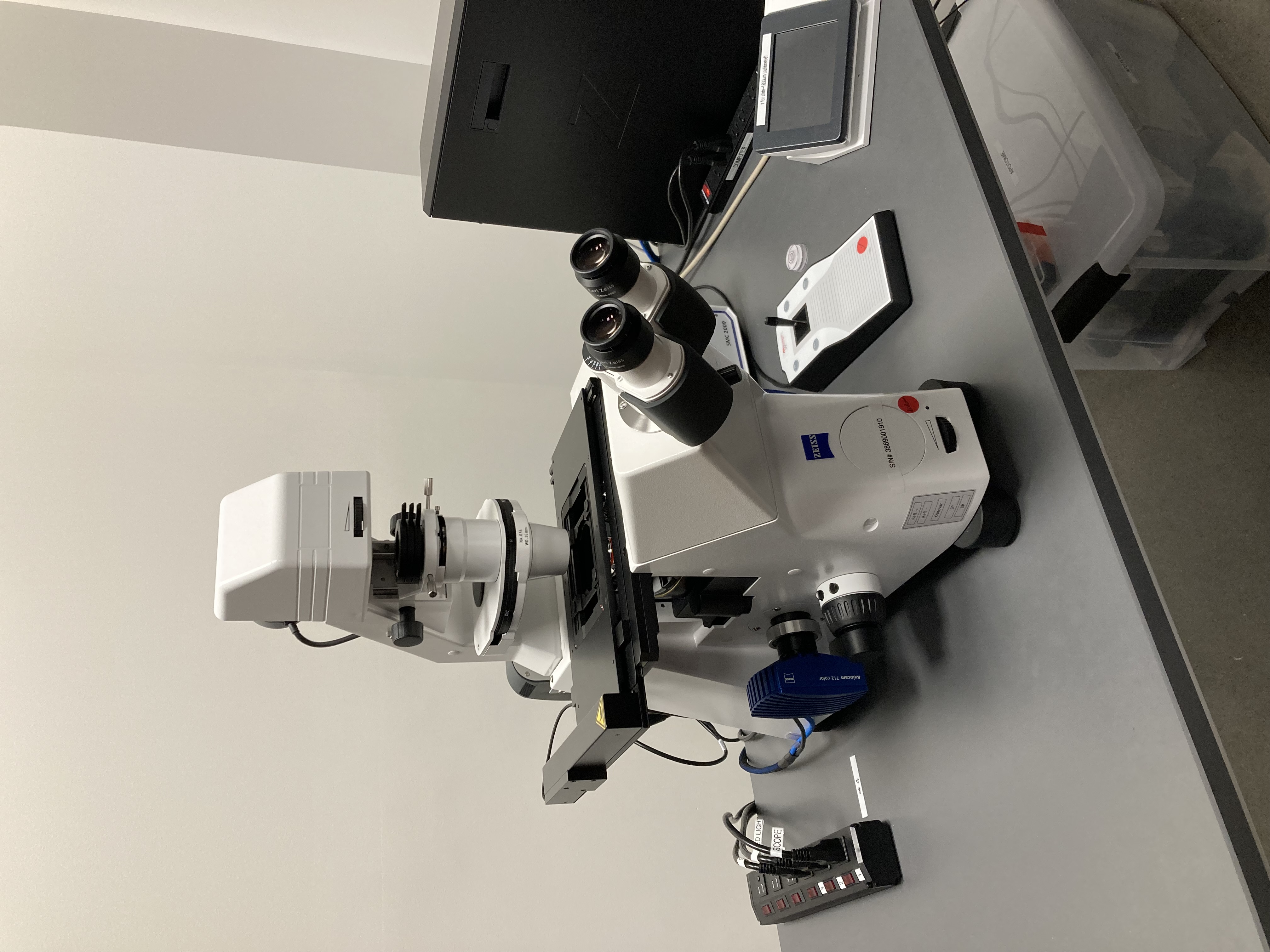 The system is built on a Zeiss Axio Observer inverted microscope stand with motorized X,Y,Z stage for acquiring Z-stacks and images of areas larger than the field of view through tiling of individual images. The stage can accept slides, plates and dishes.
