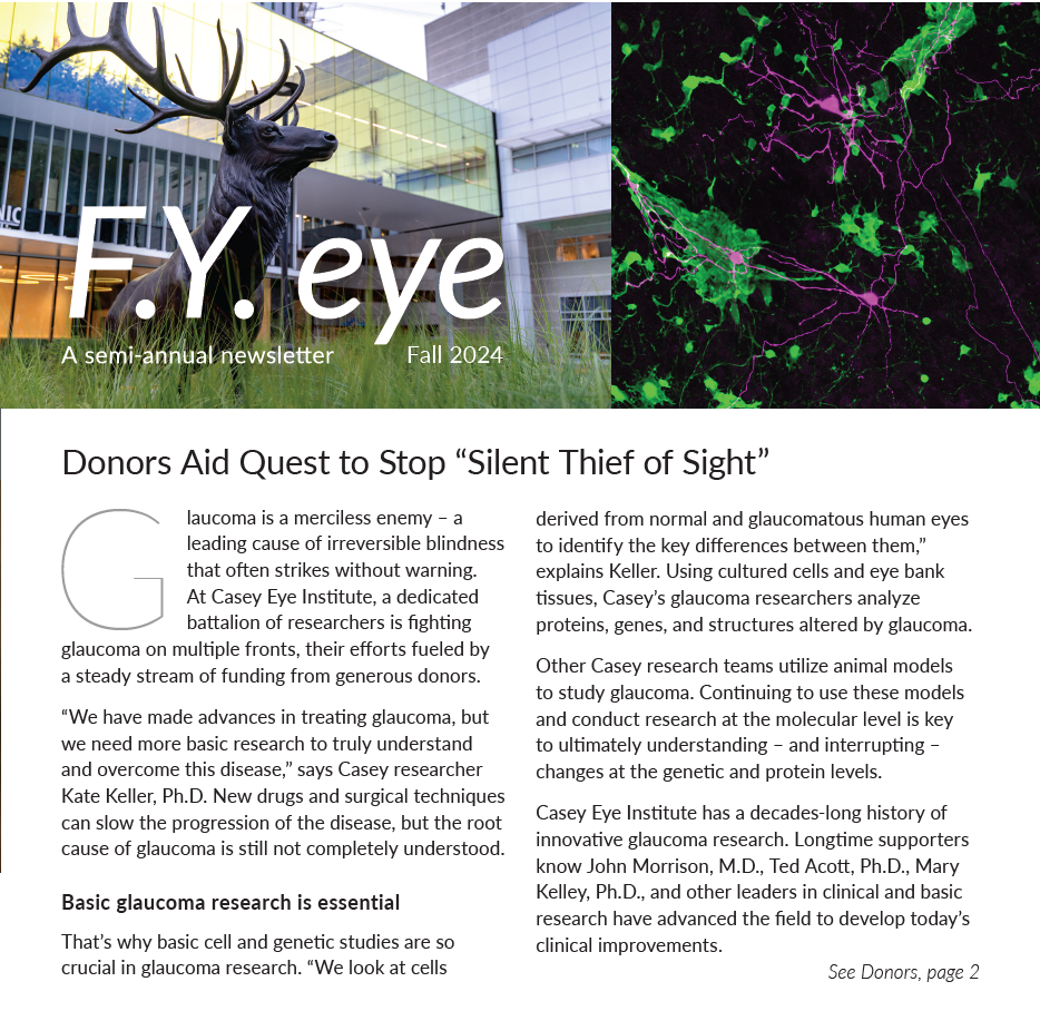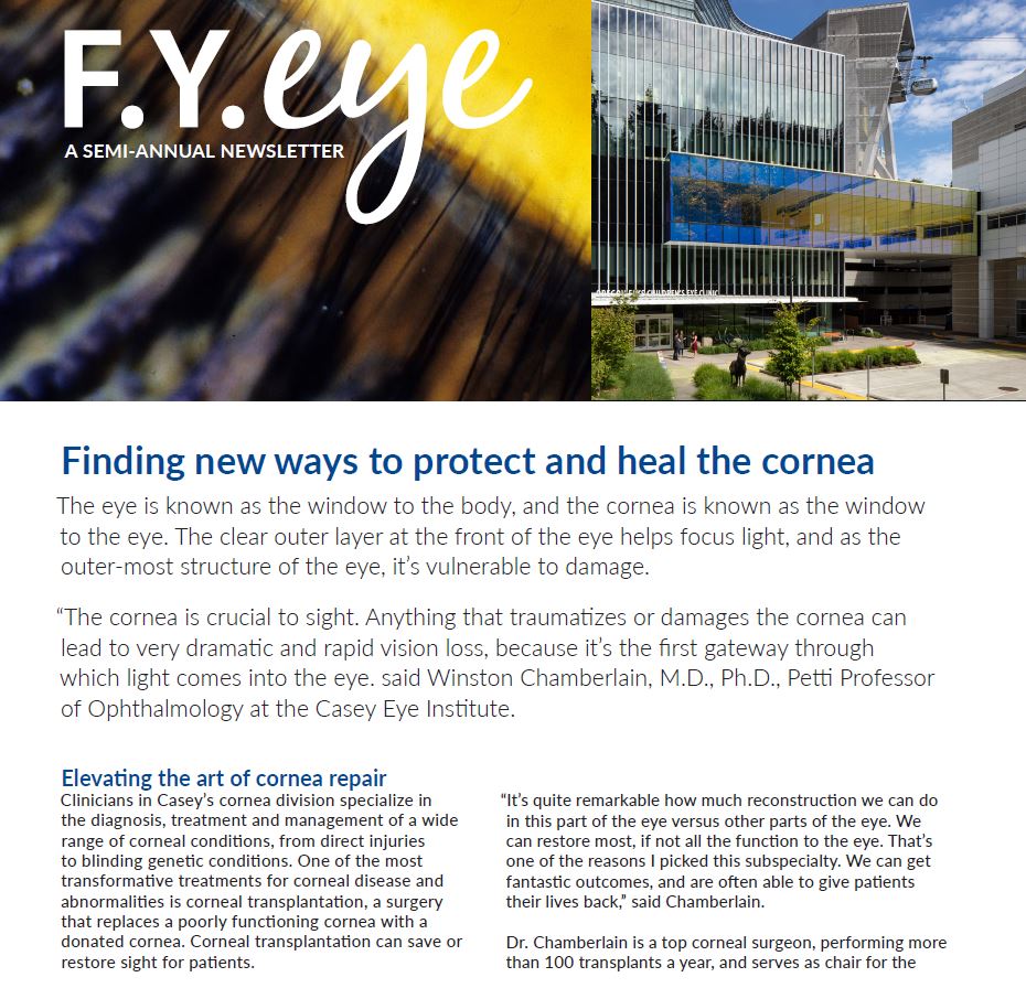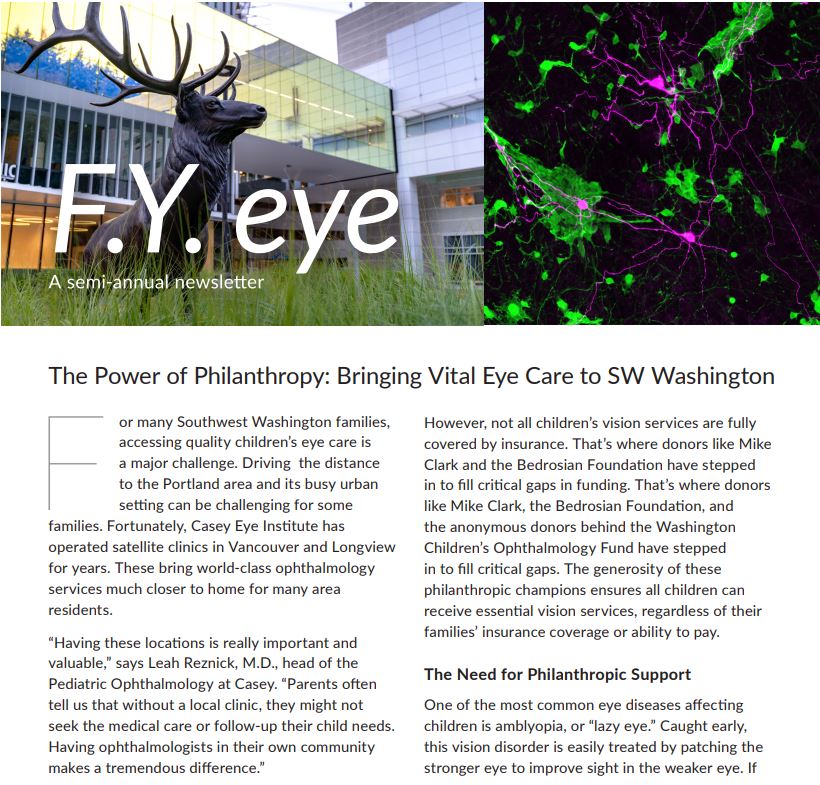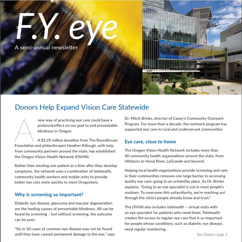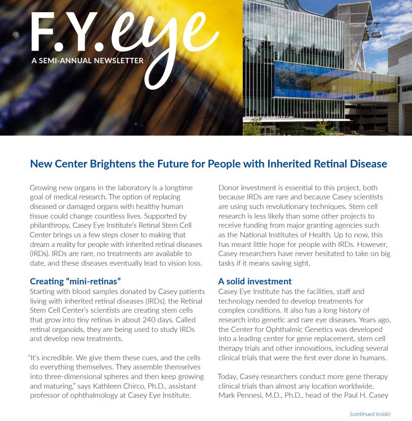 We invite you to view a selection of recent FY Eye Newsletters, which feature news, innovations, impact, patient stories and more from Casey's research, clinical care, education and outreach missions areas.