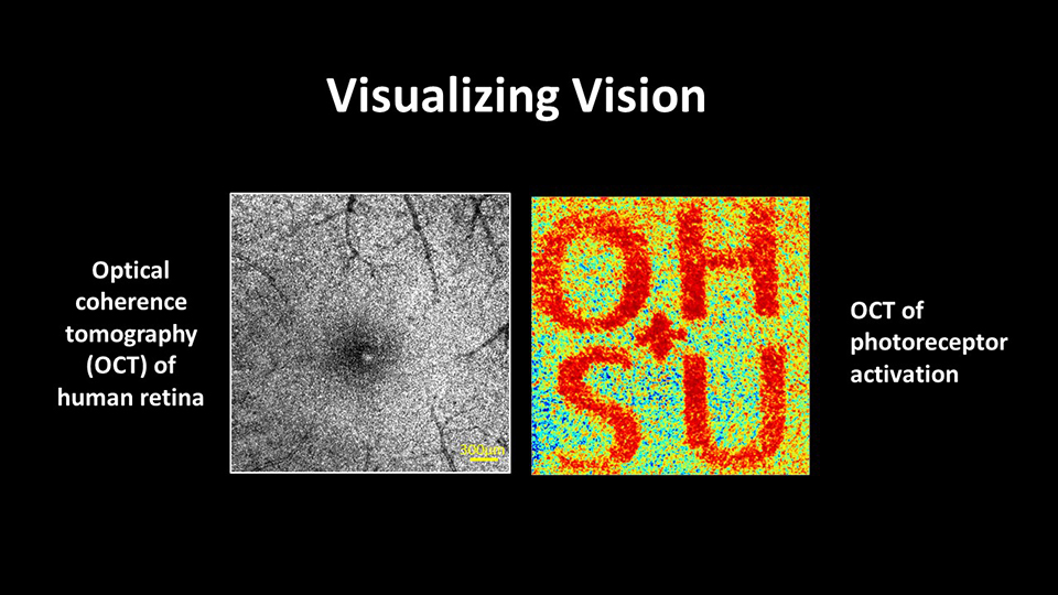 Casey Eye Institute researcher Siyu Chen, Ph.D., who works in the COOL lab, has been instrumental in this advance. He produced the graphic shown above, demonstrating how ORG technology reveals photoreceptor activation compared to a regular OCT image, where the letters “OHSU” are not visible as they are with ORG.