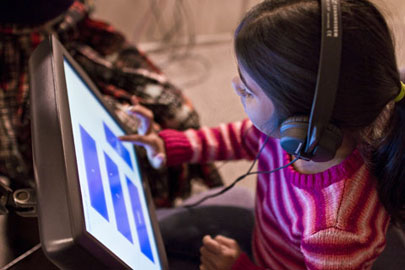 - Using a computer touch screen to select a word or sound heard in the sound booth