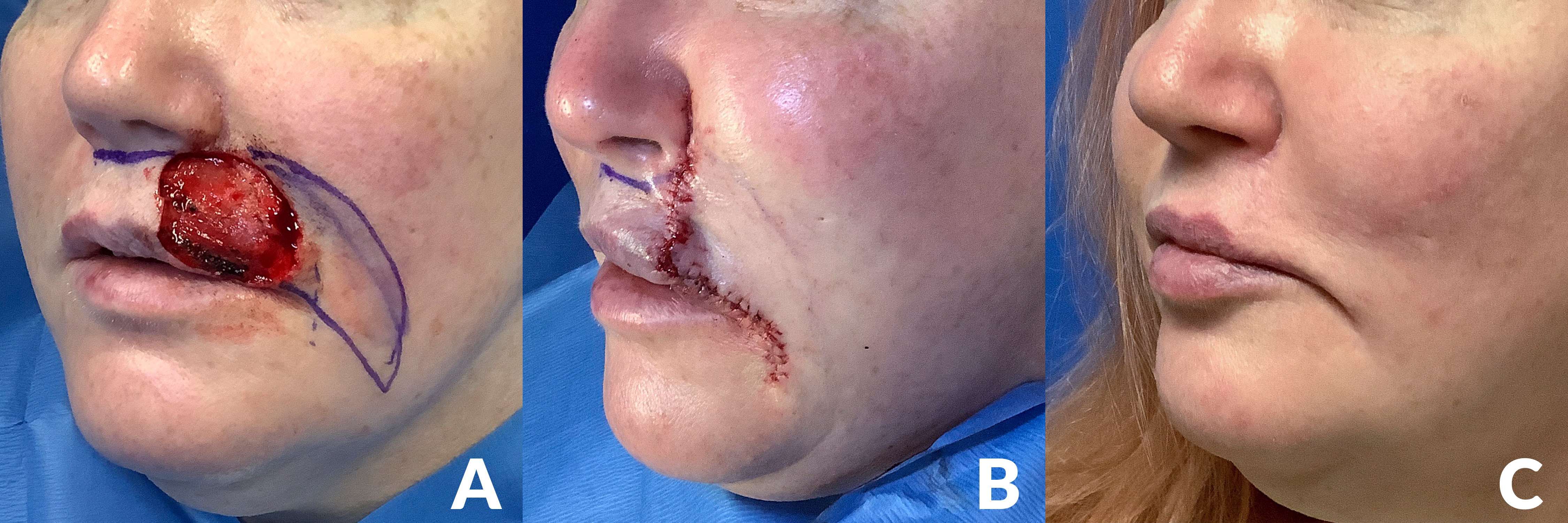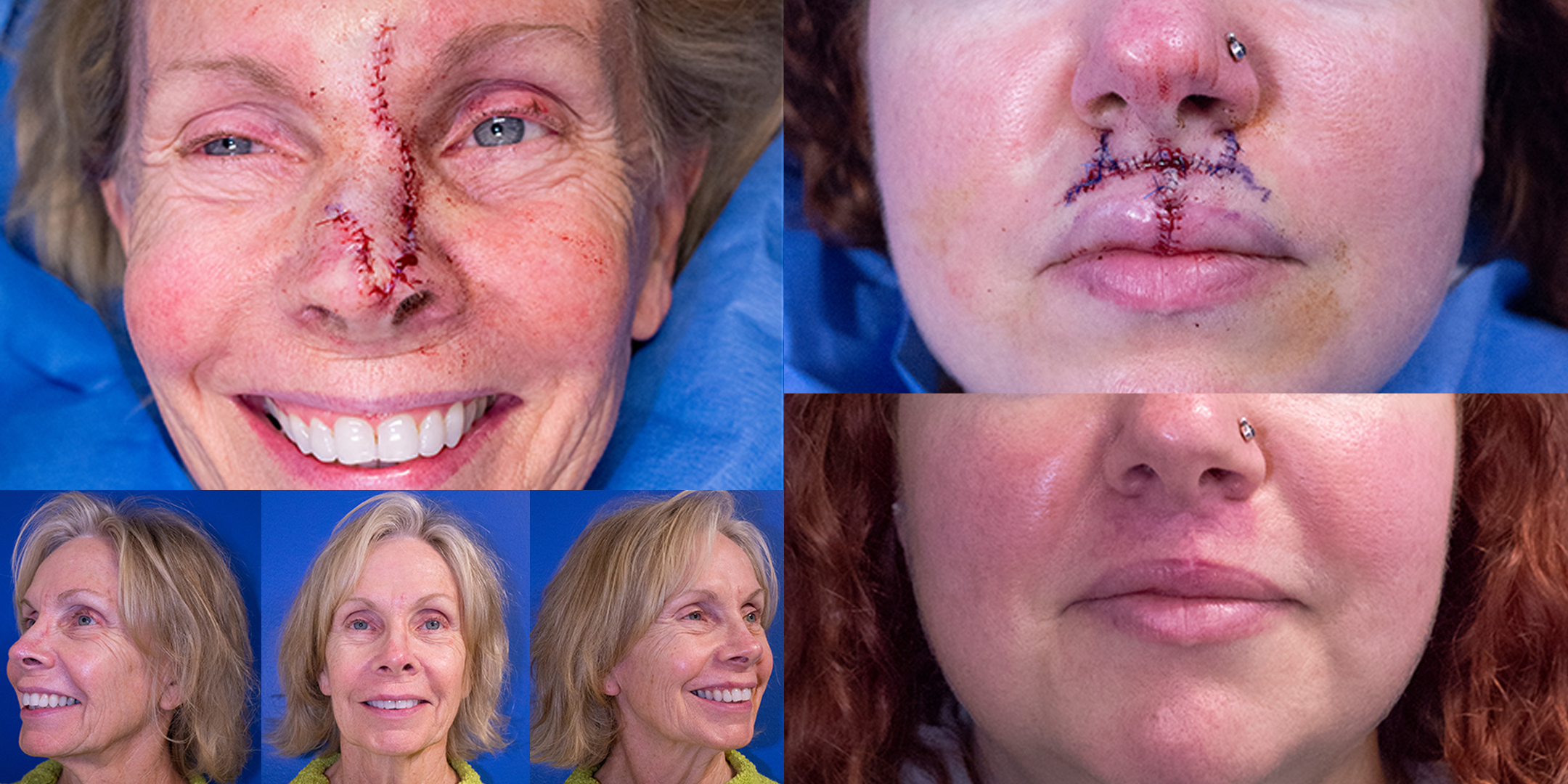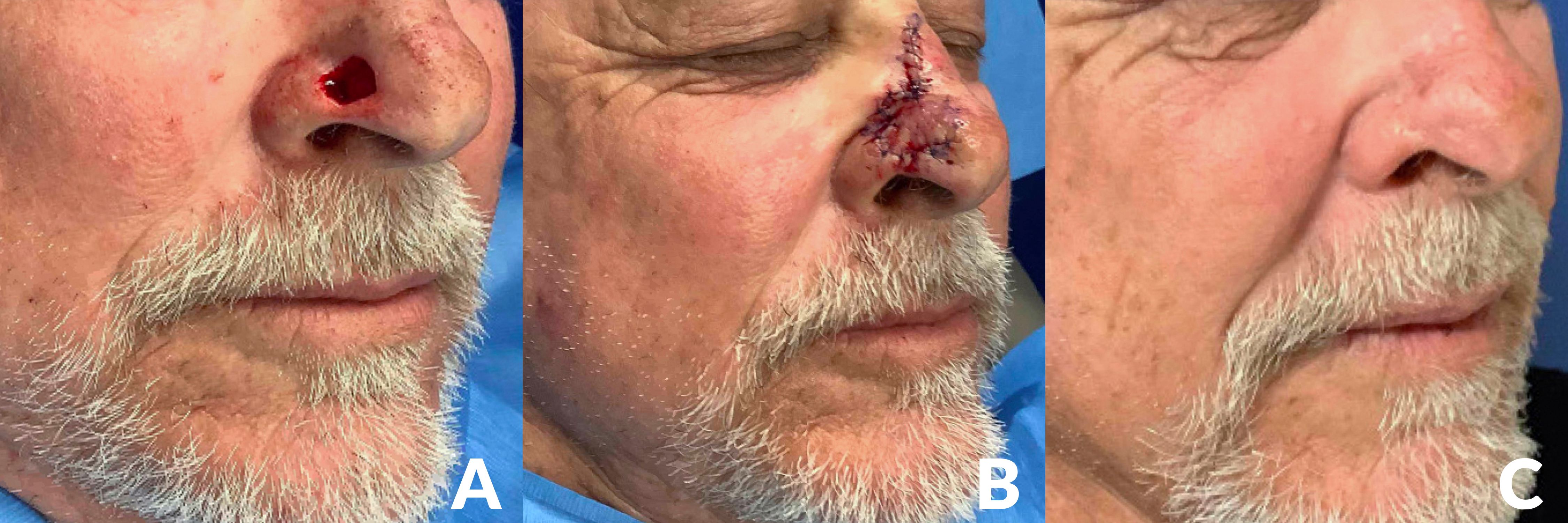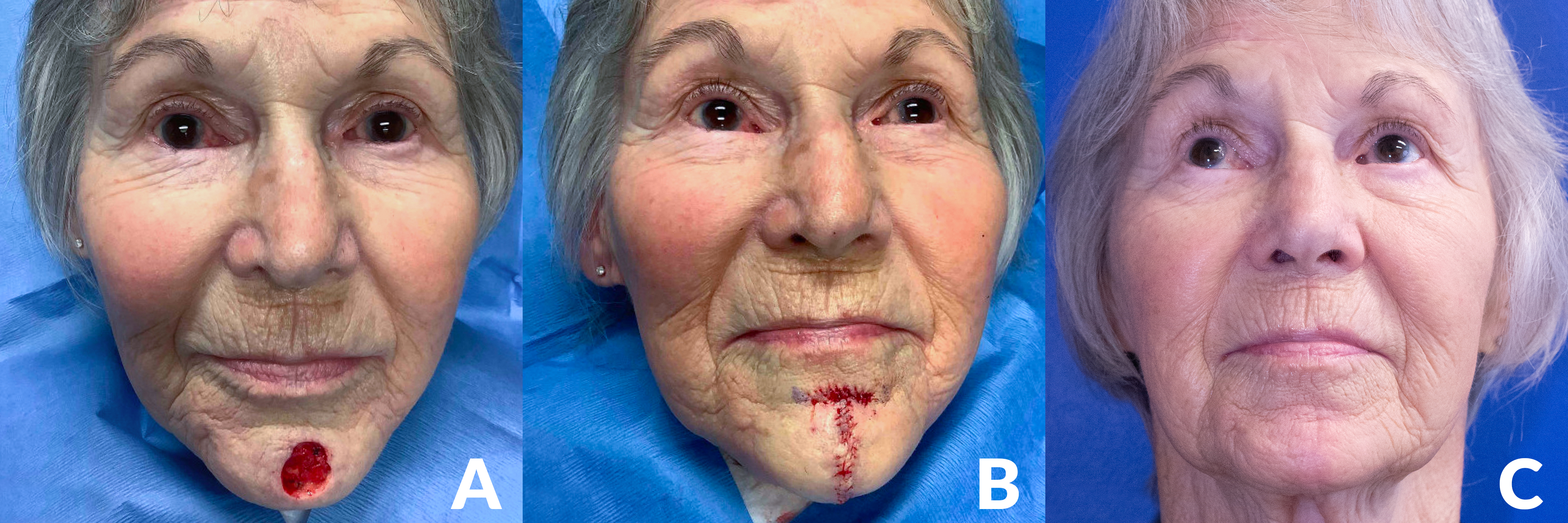 Mohs micrographic surgery offers the highest potential for skin cancer cure. Performed as an out-patient procedure, Mohs micrographic surgery removes the affected area entirely while sparing the surrounding healthy skin. Once the complete removal of the cancer has been confirmed, our surgeons perform reconstructive surgery. During the reconstructive process, our surgeons select the reconstructive technique that will allow them to limit the cosmetic affects of the procedure after it has healed. Below, you will find a gallery of photos from Mohs micrographic surgeries and their subsequent reconstructions.