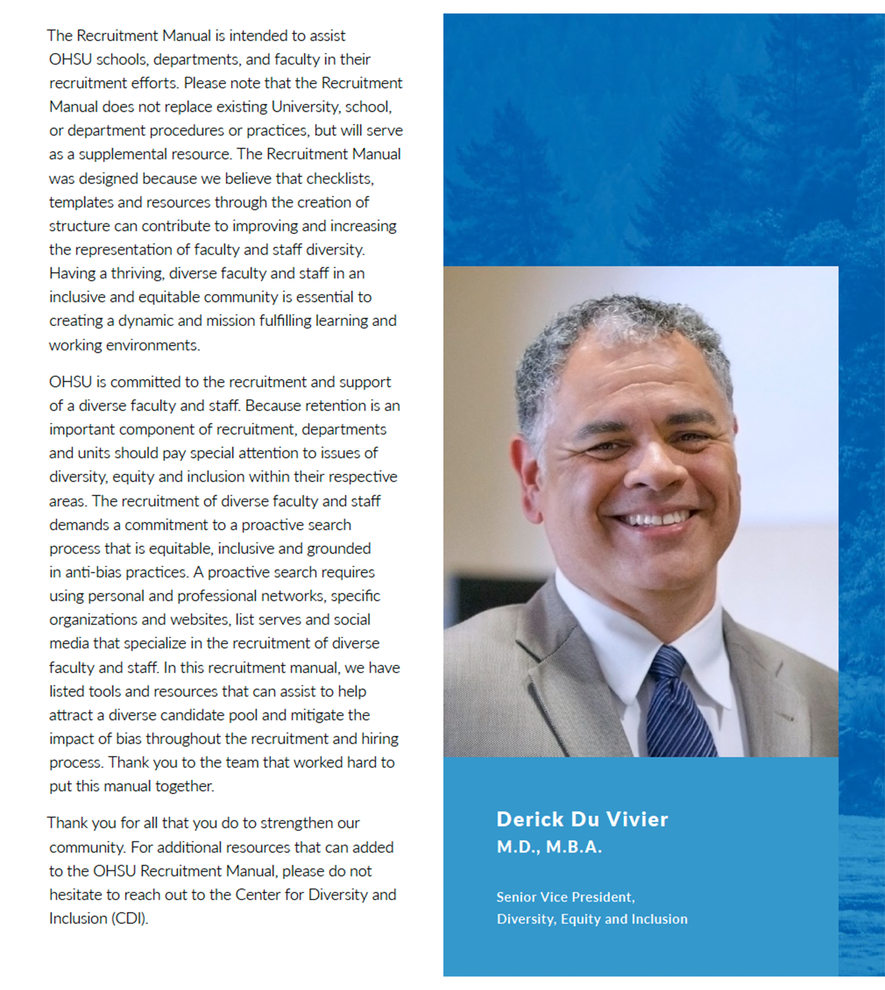 This edition of the OHSU Recruitment Manual would not exist without the ideas, insights, time and devotion of dozens of dedicated faculty and staff from across the institution. We thank everyone who contributed to creating a more diverse and inclusive community and for bringing this critical resource to life. This Recruitment manual would not be possible without the efforts of several members—Linzy Rodrigues, Tony Mareino, Lisa Huynh, Jennifer Gossett, Ian Jaquiss, Octaviano Merecias-Cuevas and Holly Yoo. Thank you to Leslie Garcia for her advice and continued partnership with this project. We also thank everyone in the OHSU community who have used the recommendations in the previous versions of this manual to shift the way you recruit, screen, interview, hire, and retain the members of your team. Because of you, we are making progress toward the vision of an inclusive campus and a stronger, healthier and more innovative future for our organization and the communities we serve.
