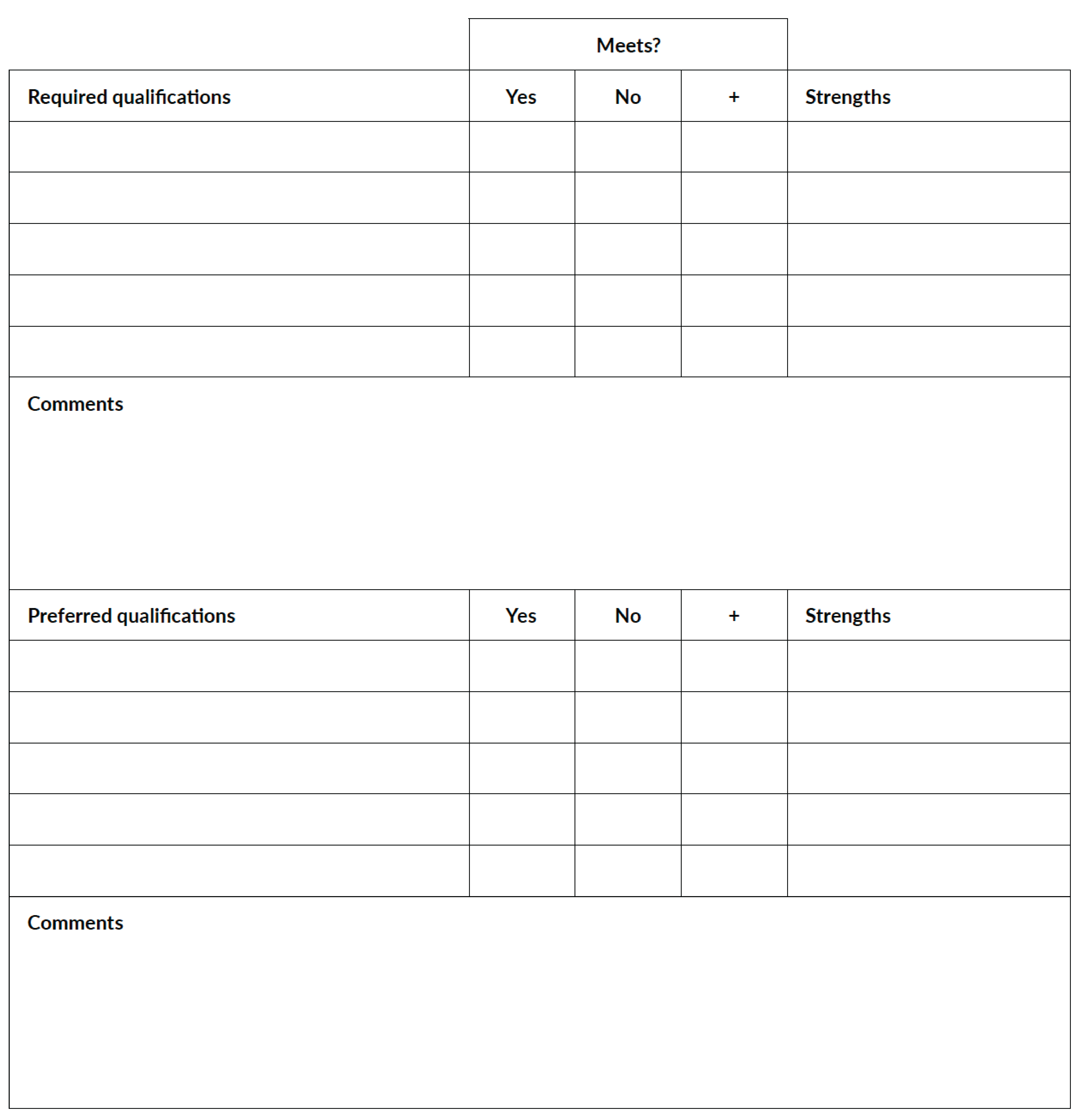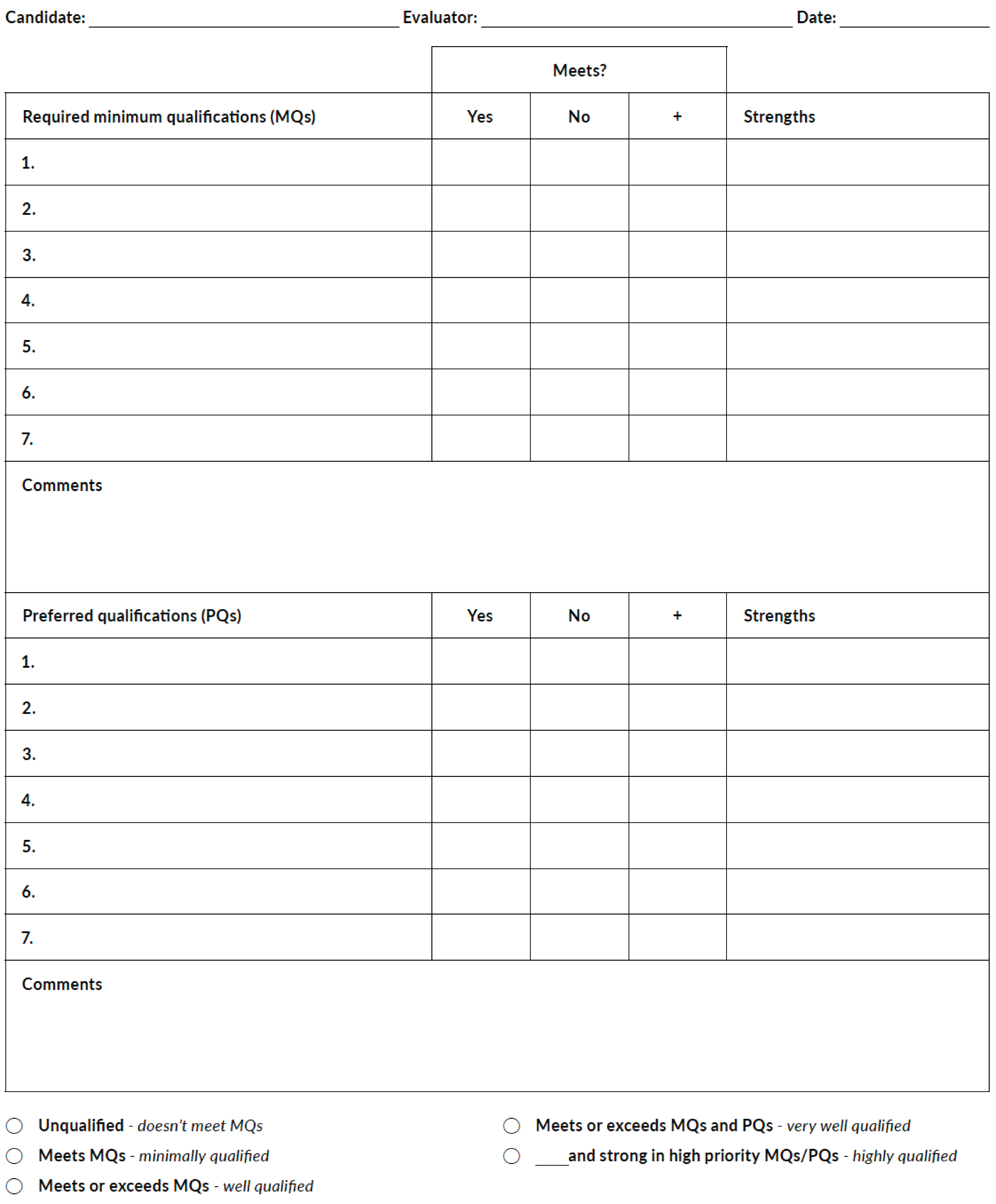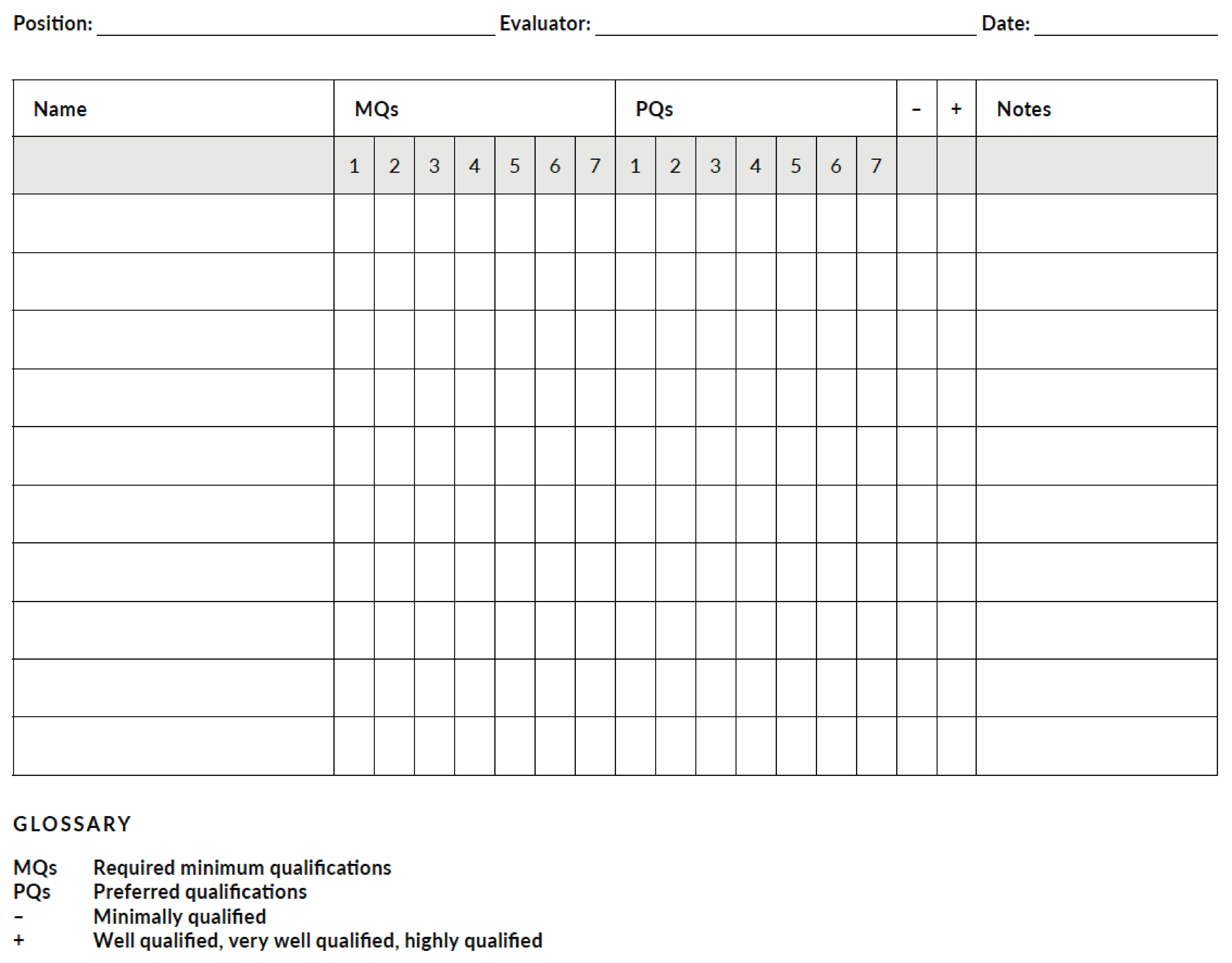 • Determine what you want to know about candidates in advance. The committee should establish a series of questions that relate to the position and are based upon the position description.
