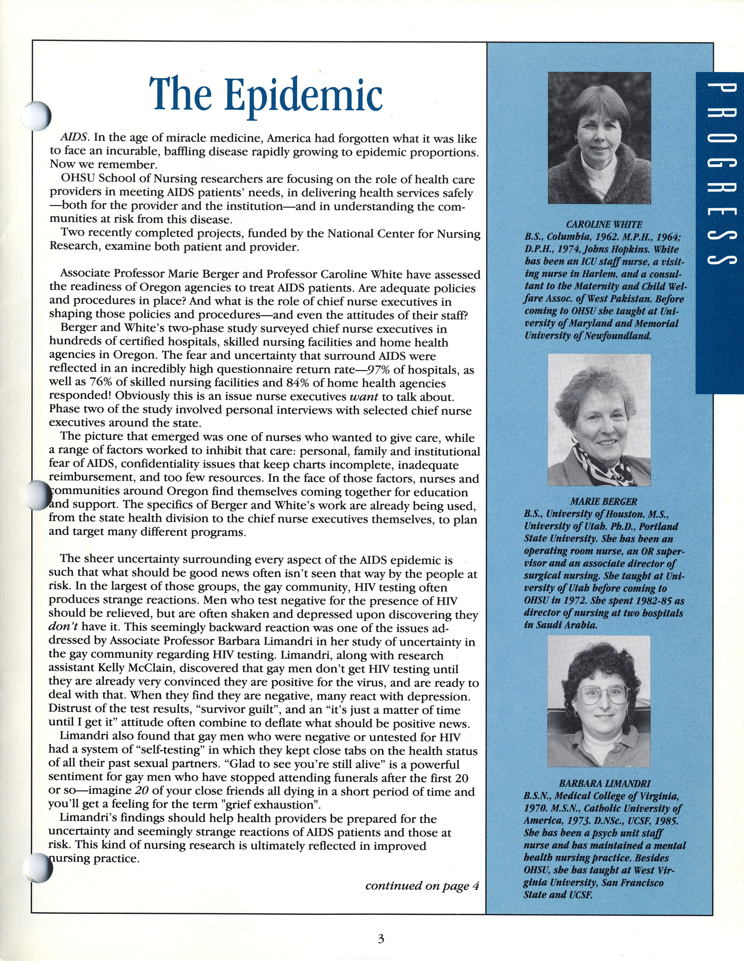 In the School of Nursing, Doctors Marie Berger and Caroline White were learning that nurses were hampered in providing quality care by a variety of legal and societal issues, while Barbara Limandri focused her research on gay men and their fears around HIV testing. And the Russell Street Clinic, OHSU’s community dental clinic, was providing compassionate dental care to HIV+ patients from around the state, as many were refused care by their local dentists.