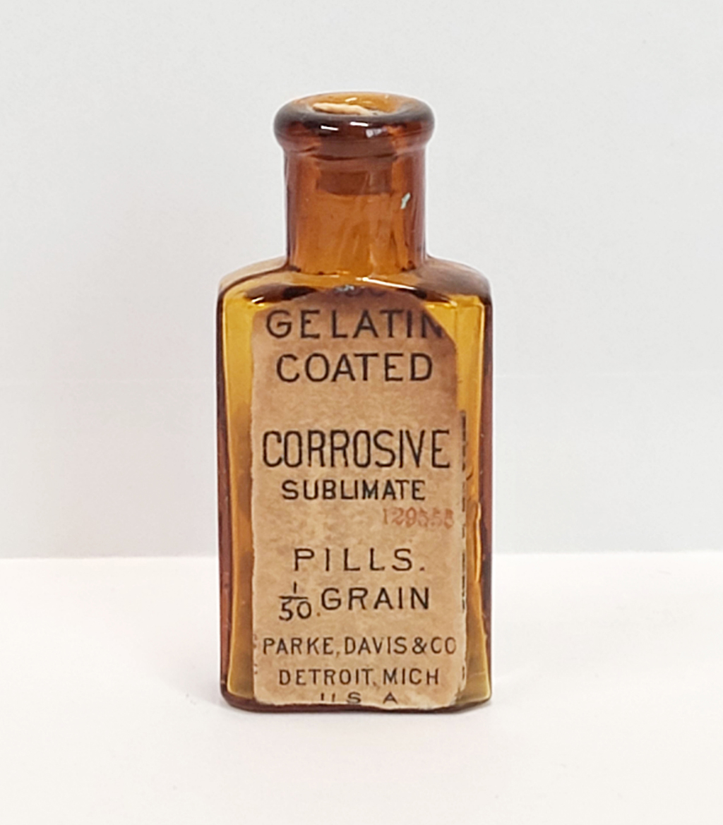 A highly poisonous compound, corrosive sublimate was used in photography, pest control, preservation, and medicine. It is more commonly known under its contemporary name of mercury chloride. In the early 20th century, it was a common over-the-counter cure for measles and syphilis and often used as antiseptic and disinfectant. It was responsible for many accidental poisonings, suicides, and suspected murders.