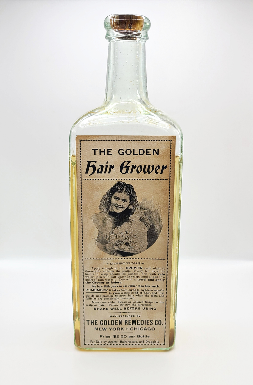 Not much is known about the creator or company behind this hair remedy. It is likely the product was not available for long as the company, Golden Remedies Co., was listed as a defunct business in 1904. This product claims to cure baldness within 8-18 months, but its ingredients are unknown.