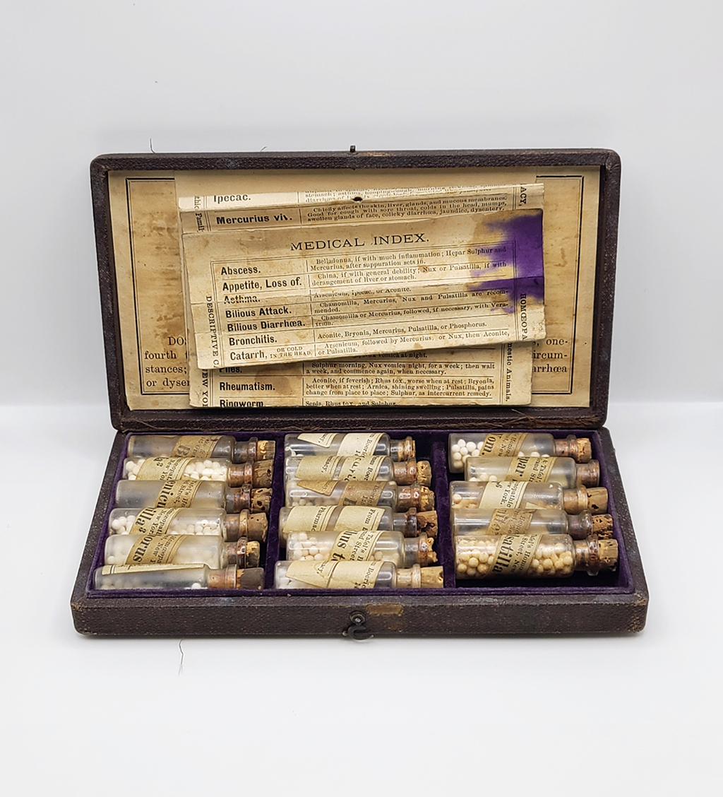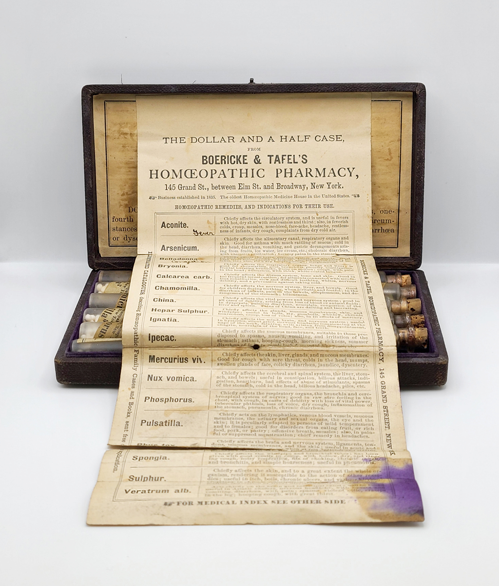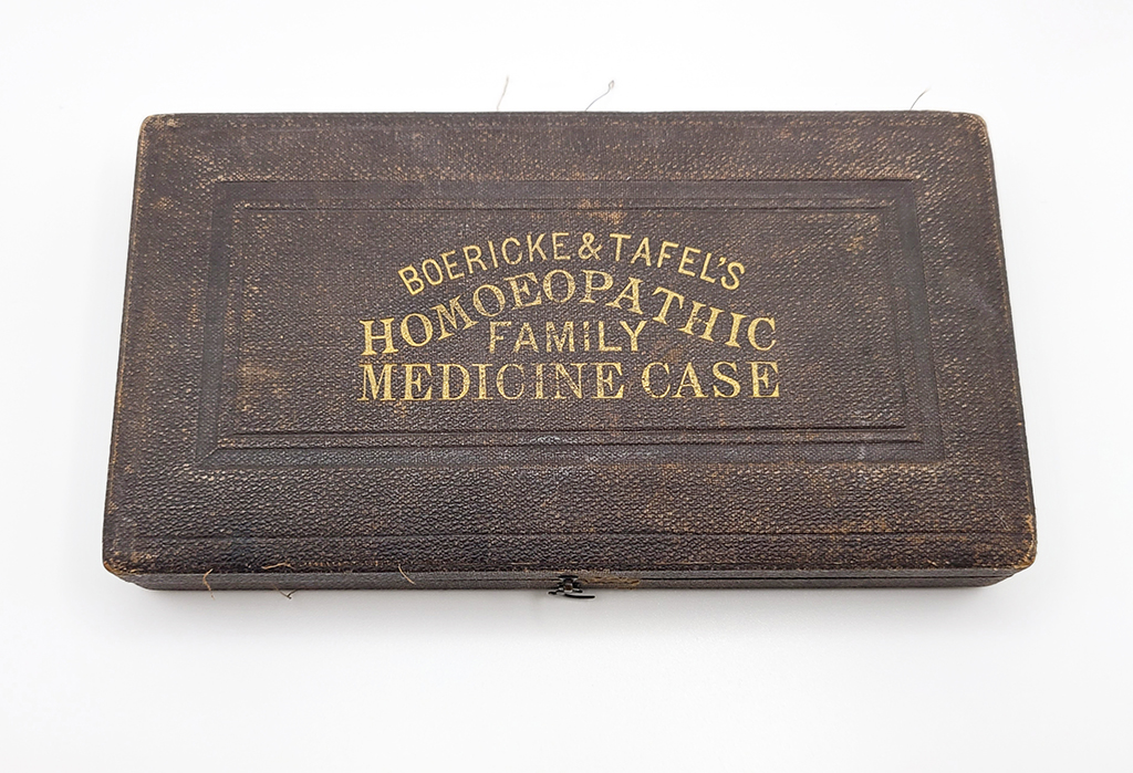 This handy kit of homeopathic concoctions was created by Boericke & Tafel’s Homeopathic Pharmacy. The kit contains 17 homeopathic remedies (the 18th is missing) along with instructions for their use. Homeopathic medicine became very popular in the 19th century as many viewed traditional medicine practices as harmful and ineffective. By the end of the 19th century, Boericke & Tafel were the largest manufacturer of homeopathic medicines in the United States.