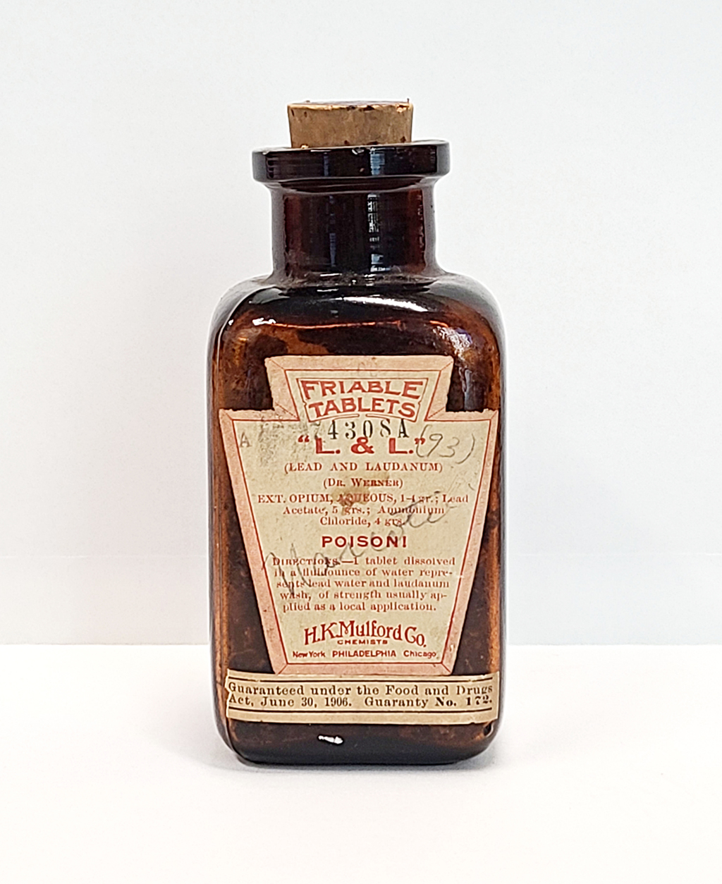 Opium is an addictive drug made from the juice of the opium poppy plant. Laudanum is a tincture of opium that is prepared by adding powdered opium to alcohol. Opium has been used in medicine, rituals, and cooking by several societies since about 5000 BCE. While these medications don’t indicate what they treated, opium and laudanum were routinely prescribed for conditions such as sleeplessness, fever, headache, cough, bladder inflammation, diarrhea, nervous disorders, and more.