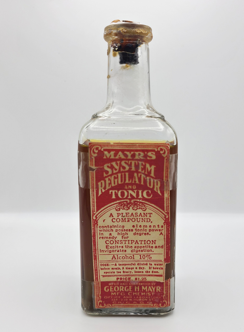 George H. Mayr’s products quickly caught the attention of federal authorities for their fraudulent claims and advertisements. This “medicine” was found to be a tincture containing aloes, salicylates, sweetener, and a healthy dose of alcohol. Mayr was charged, fined, and had the misbranded products seized by authorities.