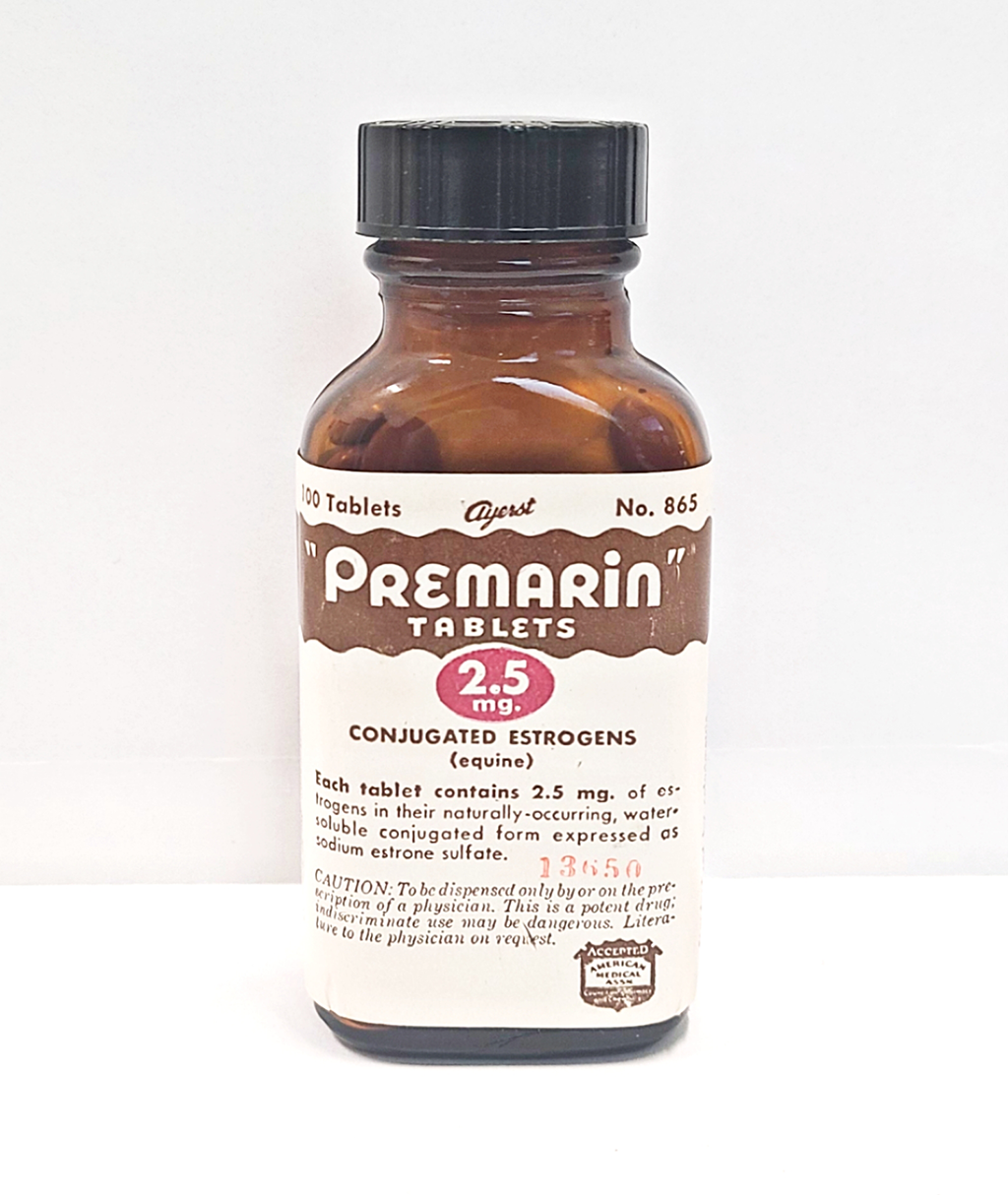 Premarin is an estrogen medication developed by Wyeth Pharmaceuticals in 1942. The name comes from its primary ingredient, pregnant horse urine (PREgnant MARes’ urINe). It is prescribed to relieve the symptoms of menopause, including “hot flashes,” night sweats, and vaginal dryness.