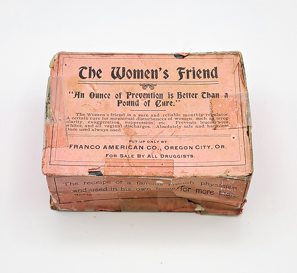 Little is known about this product or the Oregon company that produced it. It claimed to cure menstrual disturbances such as irregularity, suppression, and leucorrhea (a medical term for discharge). The fact that the instructions direct the user to use after sex suggests that it may also have been used as birth control.