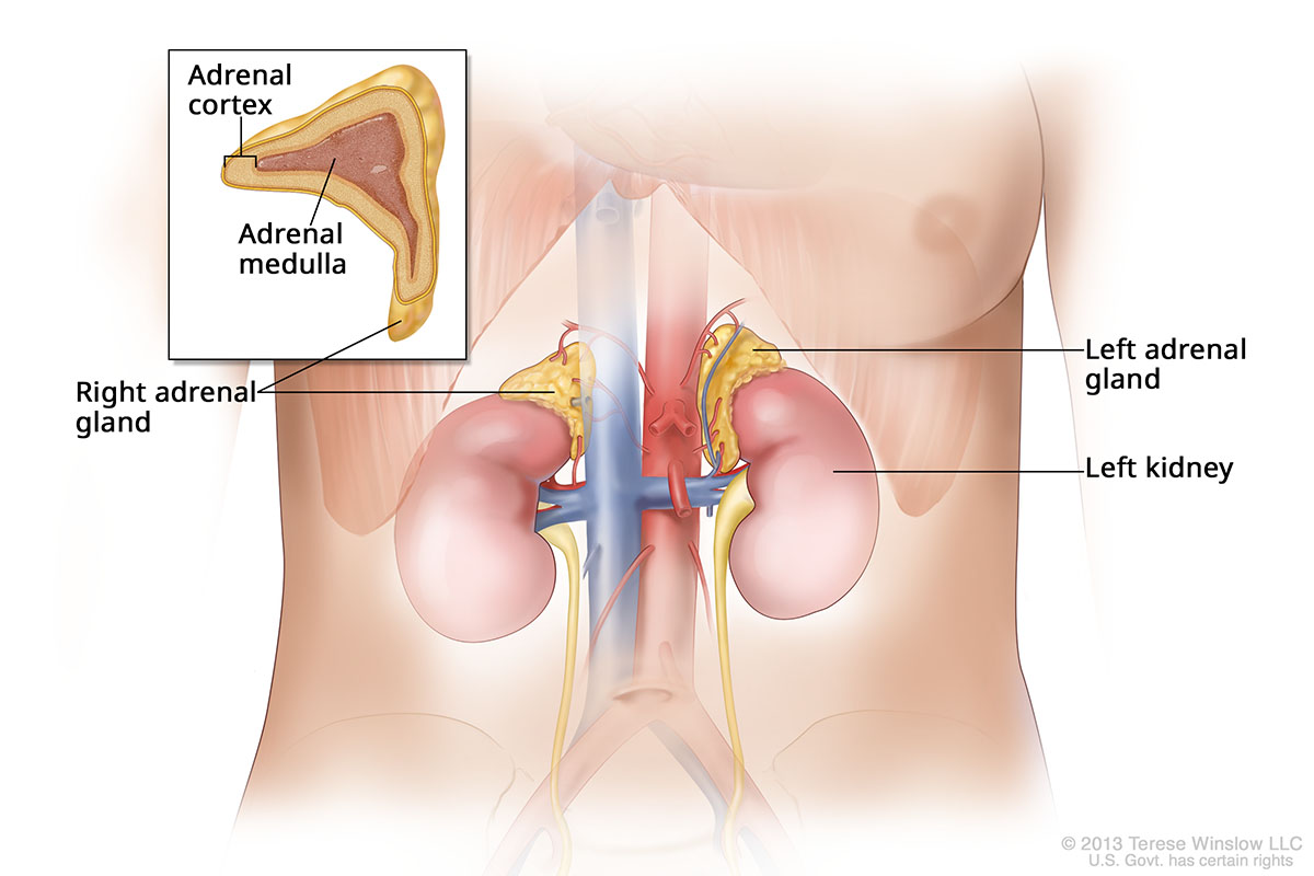 Your two adrenal glands are about the size of golf balls. They sit high in your midsection, one above each kidney.