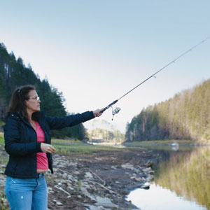 A woman is fishing on a verdant riverbank. She casts the rod with outstretched hand. The scene is peaceful and calm.