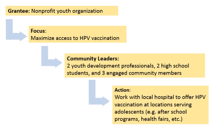- Train and provide stipends and support to 6-8 Community Leaders who will implement all five Community Action Model steps to address the selected HPV vaccination focus area.