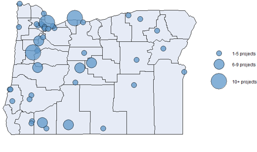 To date, the program has invested $8.8M in 246 projects across Oregon, which includes $6.6M in grant awards. While over two-thirds of the program budget directly funds projects, about one-quarter goes toward funding grantee support that provides trainings on project design and evaluation, carries out program evaluation, and supports costs to bring grantees to an annual conference to share learnings. Less than 10% of the program budget is directed to administrative costs to support the grant submission platform, distribution of awards, and organizing the annual grantee conference.