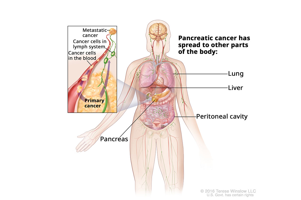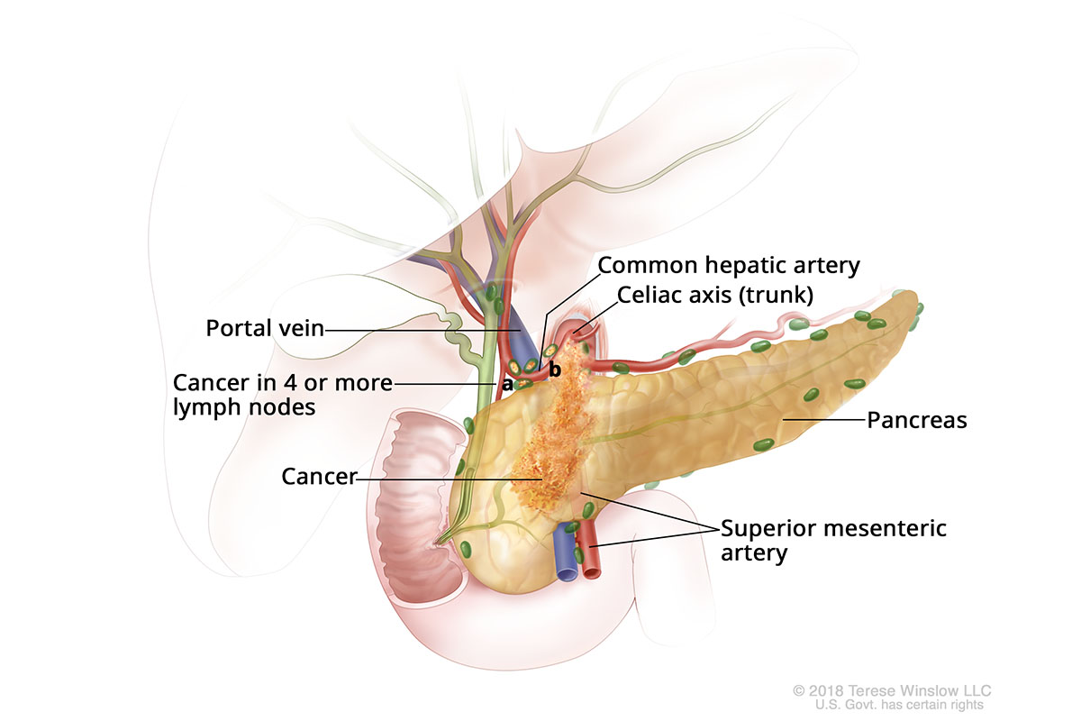 - A stage IV, or 4, is advanced pancreatic cancer. It has spread to distant lymph nodes and other organs like the liver or lungs.