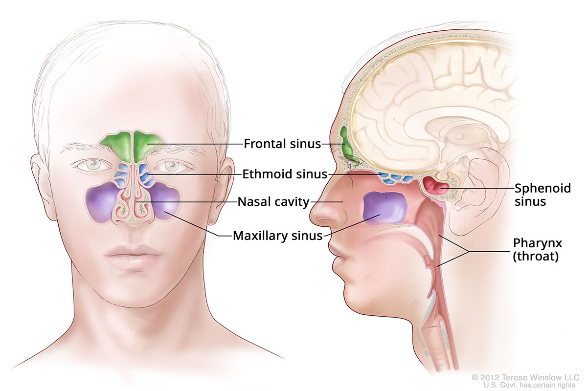 Nose: Nasal cancers are divided into two types because they may affect the space inside the nose or the spaces in the bones surrounding the nose.