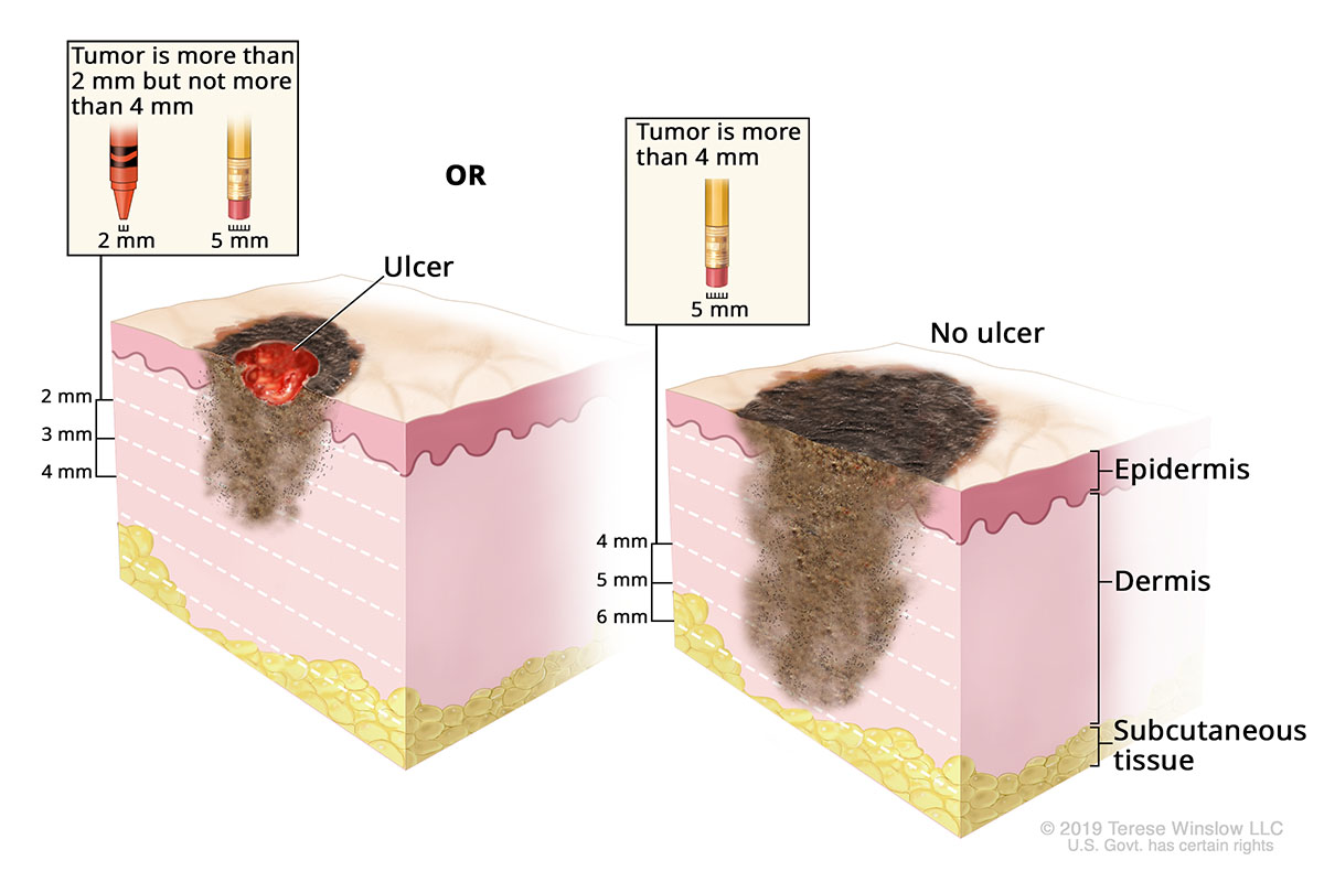 - The melanoma is more than 2 millimeters thick but no more than 4 millimeters thick and is ulcerated, or it's thicker than 4 millimeters and not ulcerated. Up to one lymph node is affected, or cancer affects nearby skin areas.