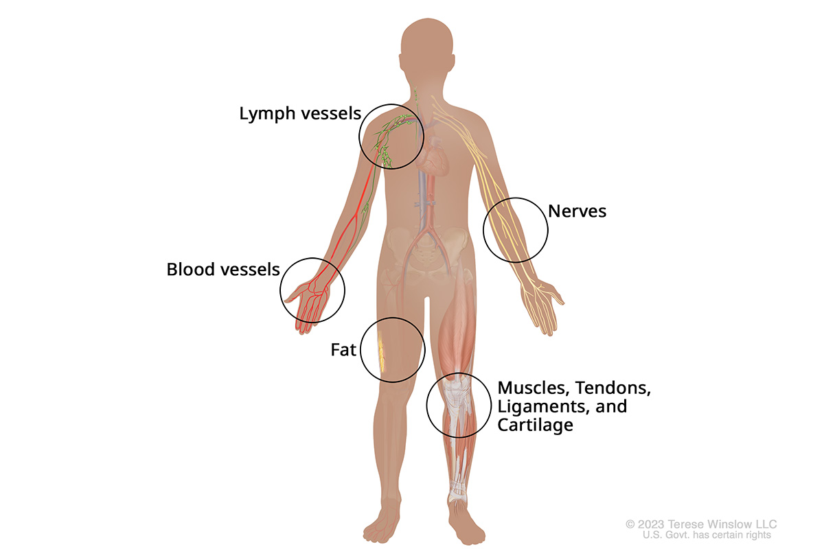 You have connective tissue throughout your body, so sarcomas can develop anywhere. Many sarcomas grow in the arms and legs.