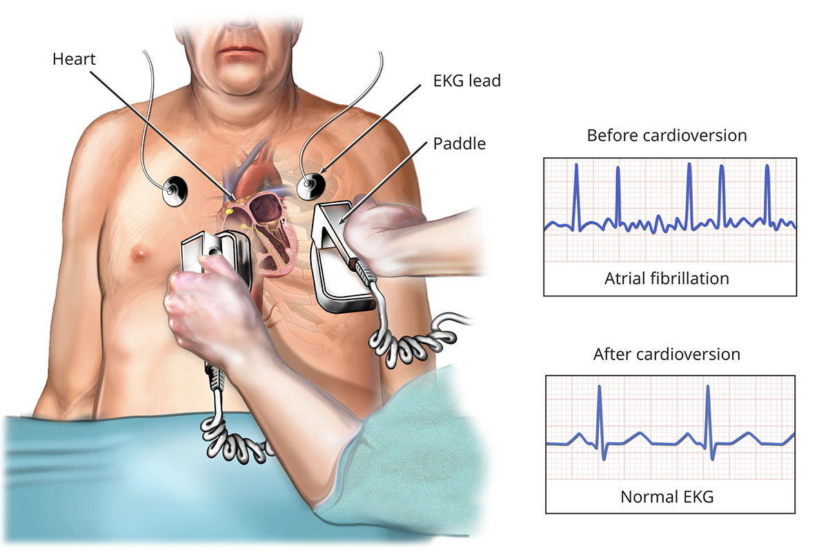 While you are sedated, your provider uses a machine outside your body to send your heart one or more controlled electric shocks. These shocks can restore a normal heart rhythm.