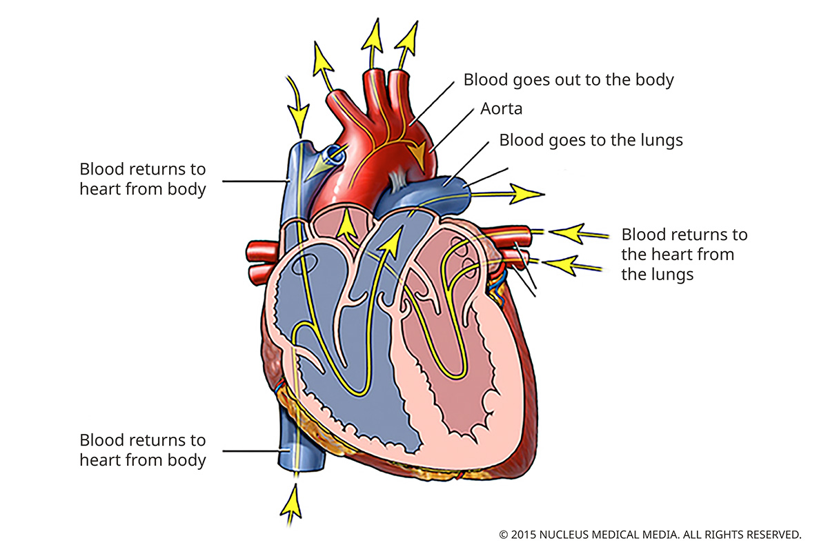 Oxygen-rich blood returns from the lungs through the pulmonary veins. It passes through the left atrium and into the left ventricle, which pumps it into the aorta. The aorta, the body’s main artery, sends the blood to the rest of the body. The heart’s valves open and close as blood passes through to keep it flowing in the proper direction.
