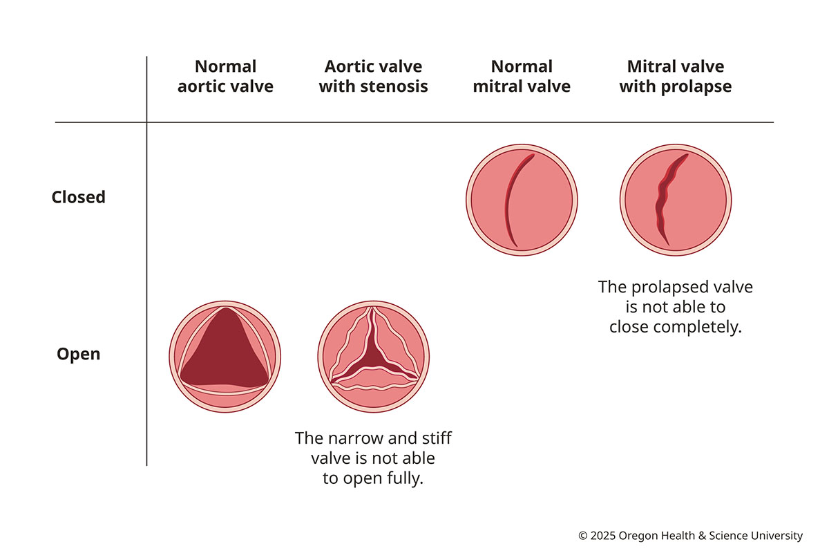Stenosis (narrowing): Valve flaps are stiff or thickened and can’t open all the way. This makes it harder for blood to flow through.