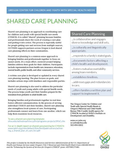 Shared care planning is a process for coordinating care for children and youth with special health care needs. OCCYSHN contracts with partners around Oregon to implement shared care planning in their communities. OCCYSHN's public health partners convene teams of families and professionals to create care plans for individual children and youth with special health needs.