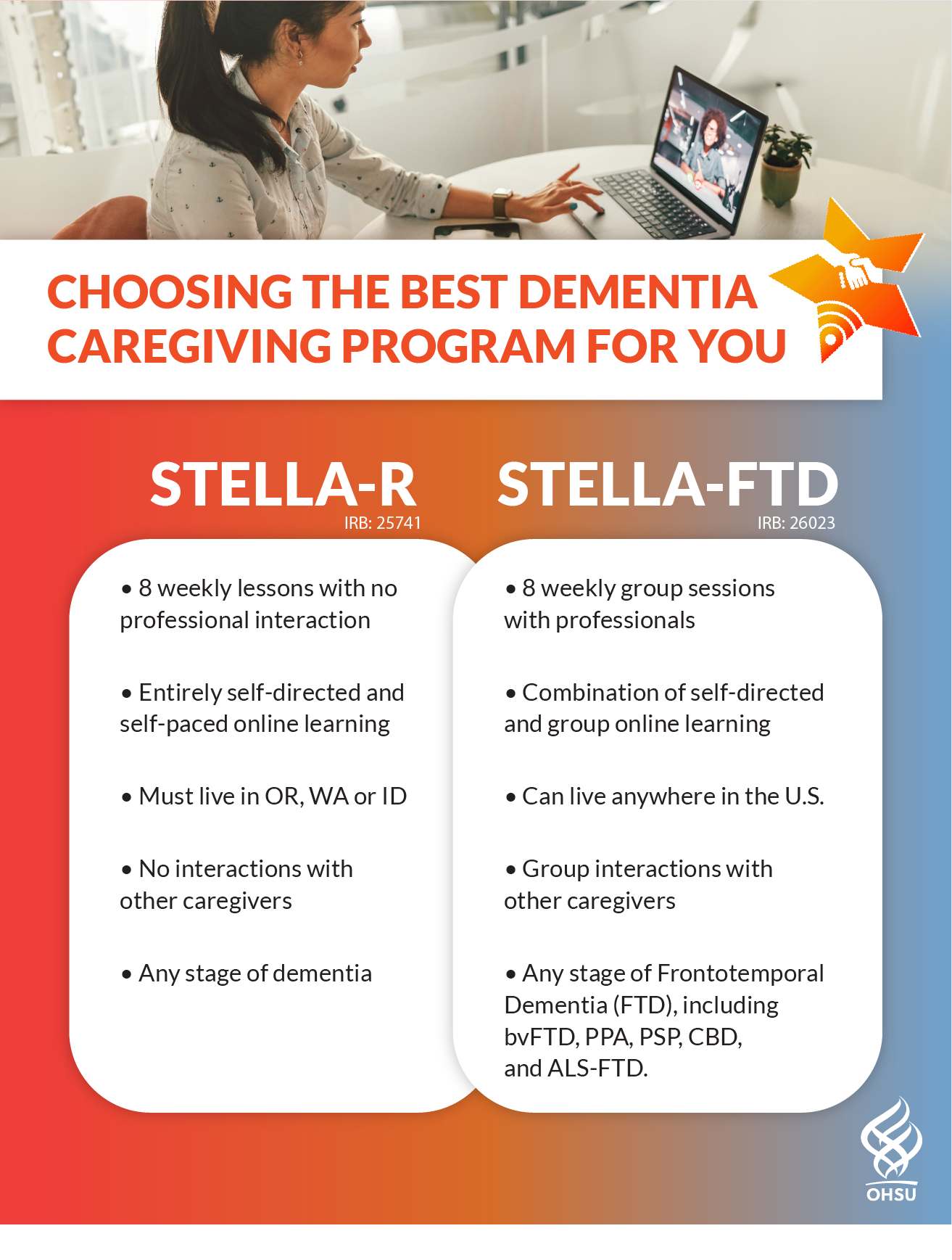 The STELLA studies started in 2016 with a grant from the Oregon Alzheimer’s Disease Research Center. Over the years, we have tested several types of STELLA interventions including STAR-C-Telemedicine, Tele-STAR, STELLA, and STELLA-FTD (pilot). Our Tele-STELLA study has finished recruiting and one of our current studies, STELLA-R, will be recruiting until June 2026. You can find out more information from the publications listed at the bottom of this webpage.