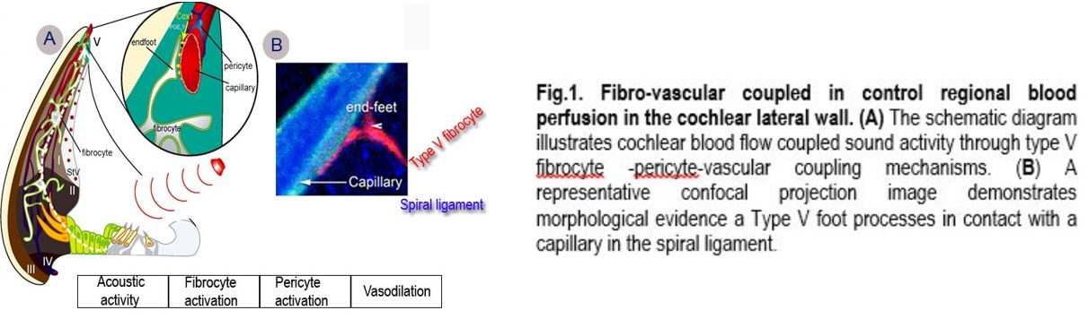The cochlea is a high energy demand organ which transduces acoustic input to electrical signals within a time scale of microseconds. The transduction critically depends on adequate vascular support to provide a sufficient supply of oxygen. Regulation of cochlear blood flow includes central neural and local and auto-regulatory pathways at the level of artery, arterioles and capillaries. Dr. Shi's lab particular focuses on myogenic properties of pericytes in the spiral ligaments in controlling capillary blood flow and maintaining microvascular homeostasis. The pericytes in the spiral ligament express contractile proteins, including α-smooth muscle actin and tropomyosin, and exhibit vasocontractility under both in vivo and in vitro conditions. The contractility of pericytes affects flow resistance of the vascular network, and alters overall blood flow. Pericytes may be also functionally linked to form a "pumping system" to regulate blood flow. A recent experiment from Dr. Shi's lab has demonstrated that cochlear blood flow is modulated by lateral fibrocyte input (Fig.1). Fibrocytes have long been regarded to facilitate generation of the endocochlear potential by recycling K+ from hair cell transduction, through gap junctions to strial intermediate cells and marginal cells, into the endolymph. Dr. Shi's lab discovered a novel that cochlear blood flow (CBF) is regulated by a fibro-vascular (type V fibrocyte-pericyte) coupled control mechanism signaled by both lactate, acting through monocarboxylate transporter 1, and nitric oxide, produced by neuronal nitric oxide synthase. The mechanisms underlying the pathophysiology of cochlear blood flow is of fundamental clinical importance. A better understanding of cochlear blood flow (CoBF) will enable more effective management of hearing disorders resulting from aberrant blood flow. Dr. Shi's laboratory is actively in the study of regional signals in control of cochlear blood flow and change of blood flow under various pathological conditions such as loud sound stimulation.