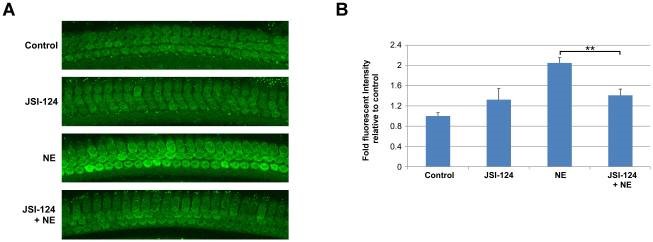 Current projects focus on the signal transduction mechanisms by which loud sound alters blood flow, vascular permeability and cellular damage in multiple cells types in the cochlea including outer hair cells, fibrocytes and endothelial cells. We have found that the JAK2/STAT3 plays a key role in the generation of reactive oxygen species in outer hair cells. Signal transducer and activator of transcription 3 (STAT3) is a transcription factor, activated by phosphorylation in response to cytokines, hormones, growth factors and vasoactive agents. Transcriptional targets of STAT3 include vascular endothelial growth factor, manganese superoxide dismutase and survivin. Inhibiting the JAK2/STAT3 pathway (with JSI-124) reduces loud sound-induced reactive oxygen species in outer hair cells as shown by fluorescent intensity (CellROX Green, 488) at 2 h following noise exposure (NE) shown below. Further studies reveal that STAT3 inhibition increase outer hair cell survival within the basal region of the cochlea improves auditory brainstem responses.