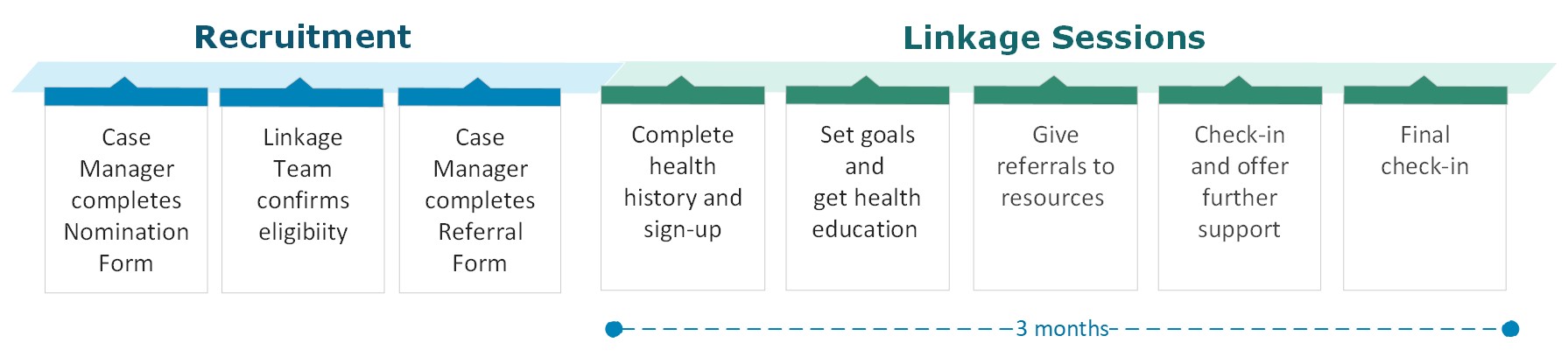 7. Linkage Project Team works with Participant for 3 months. Case Managers will receive a Linkage Plan (outline of health education and goals agreed upon with participant) and can check in as needed during this time with the Linkage Team.