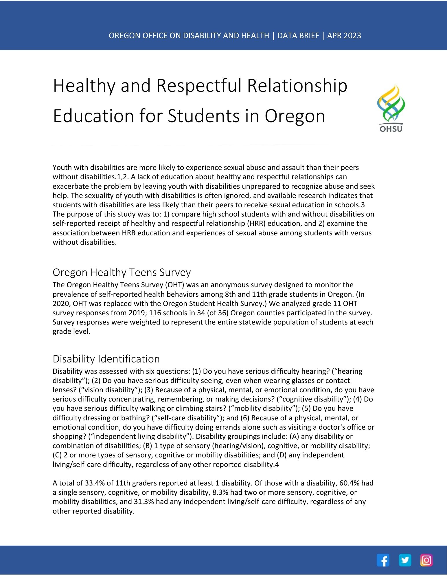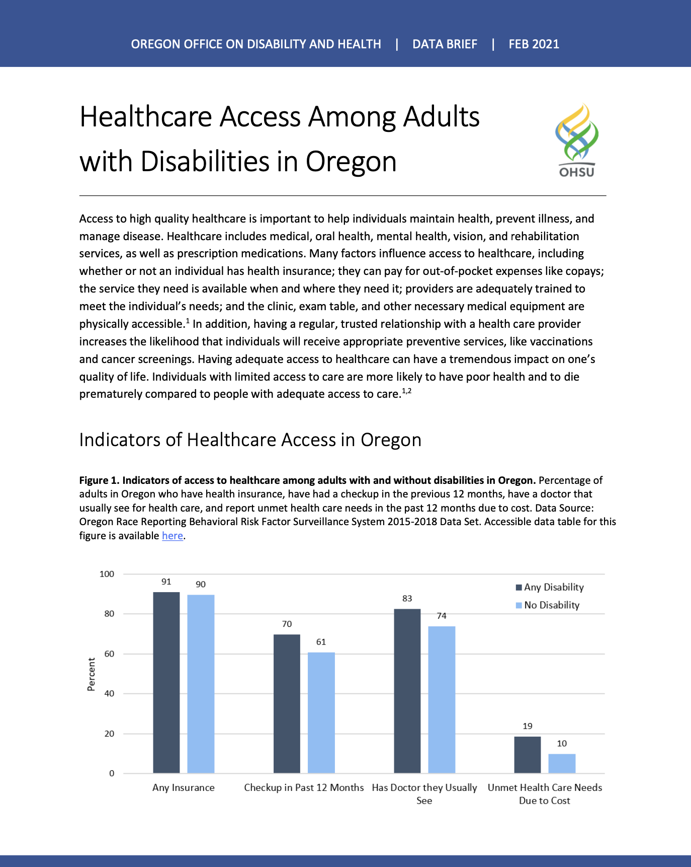 Oregon Office on Disability and Health analyzes Behavioral Risk Factor Surveillance System data (both national and state-specific) each year and highlights significant health disparities found in the disability community in topic-specific data briefs [see below]. The data briefs compare the data from specific questions included in the Behavioral Risk Factor Surveillance System questionnaire's core module that reveal health disparities and reflect the state of health among people with and without disabilities in Oregon in comparison to people with and without disabilities in the United States.