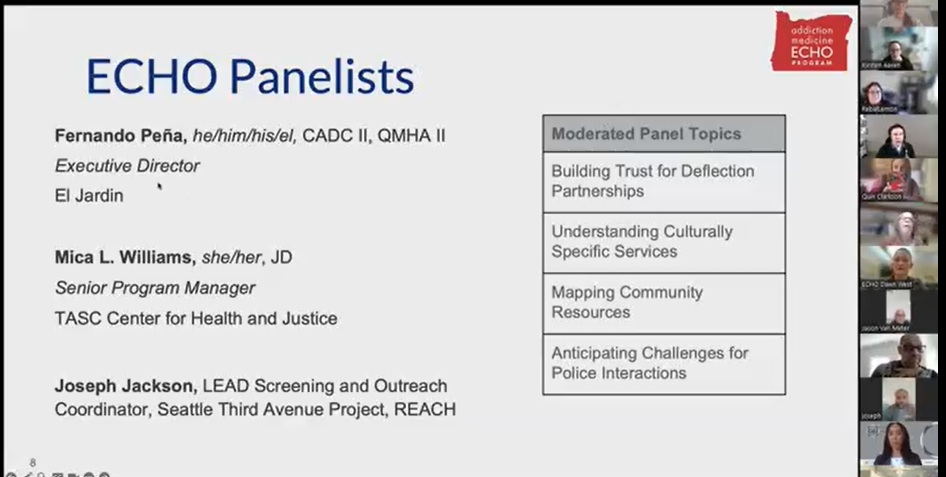 The purpose of the Deflection ECHO is to connect Oregon teams to deflection experts, develop core skills for the deflection workforce, and function as a peer-to-peer networking space for Oregon’s deflection programs.
