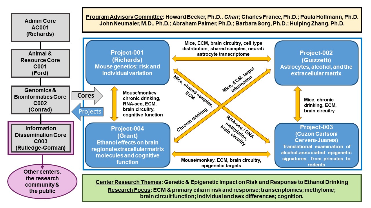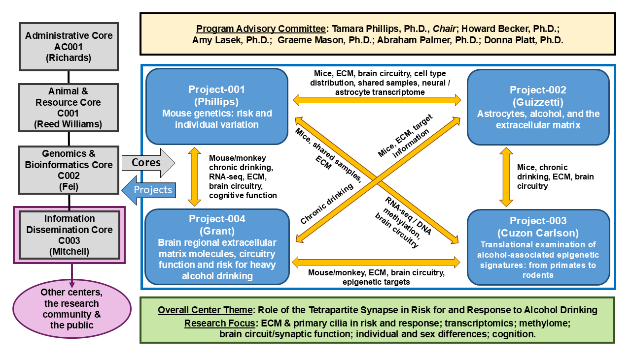 Our bioinformatics efforts have enabled expansion of a key strength of our group from the analysis of the contributions of individual genes on behavioral functions of the whole organism to include gene network identification and extend our analyses to considerations of both coexpression and cosplicing, as well as differential wiring and differential variability; this continues in the Genomics and Bioinformatics Core (C002). Our Animal & Resource Core (C001) generates mice and collects behavioral data to provide consistency for all components of the center. In addition, the PARC has an extensive network of collaborations with alcohol researchers at other institutions, including those linked to other Centers and consortia. The figure shows the current PARC components, Leads, Program Advisory Committee members and interactions. In summary, the PARC seeks to identify genetic factors that place individuals at risk or protect them from alcoholism, and to identify genetic and neural consequences of excessive alcohol use, with a particular focus on those genetic factors that contribute to changes in synaptic function relevant to alcohol addiction. This knowledge will facilitate intervention and development of better therapeutics to treat alcohol use disorders.