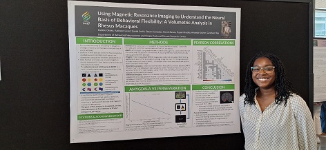 Debbie is interested in attending medical school but her experiences at the Oregon National Primate research Center (ONPRC) have made her consider applying to MD/PhD programs. Debbie has been working with Dr. Grant using magnetic resonance imaging (MRI) in rhesus monkeys to determine whether the brains of monkeys that show more flexibility in responding to environmental change differ from those that show less flexibility. This project has enabled Debbie to take advantage of the unique learning opportunities provided by the ONPRC and the researchers who are at the cutting edge of understanding the brain-behavior links in nonhuman primates, and the connection of these links to alcohol and substance use. Debbie commented that one thing that surprised her was the number of people who were critical to the research team from the veterinary staff caring for the animals, to the staff building and maintaining equipment, to the researchers analyzing and interpreting the data. She had thought that researchers were figures like Dr. Grant, her faculty colleagues and students, but realized that there is a network of collaborating individuals needed to make the research possible.