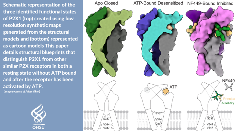 In a new paper published in Science Advances, Dr. Steven Mansoor and Adam Oken, B.A., a graduate student in the Mansoor lab, used advanced imaging techniques to look at the structure of the P2X7 receptor once it’s bound to five known antagonists and a new one they discovered. Antagonists are molecules that bind to the receptor and prevent it from activating, effectively blocking receptor function. Antagonists against P2X7 receptor could be aimed at treating conditions resulting from neuroinflammation, vascular inflammation and even cancer. Read more in the OHSU News story and their paper in Science Advances.