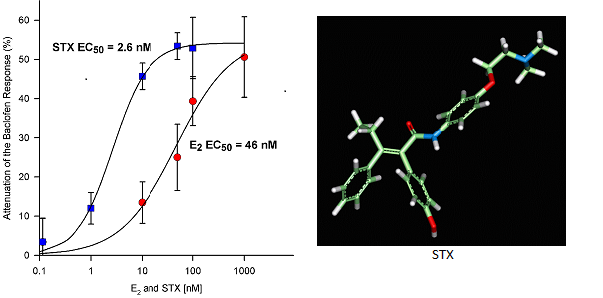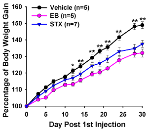 As proof of principle, estradiol is known to control feeding behavior, energy homeostasis and core body temperature. STX appears to mimic all of these CNS actions of estrogen in female rodents (Figures 3 & 4). In addition, estradiol has been known to have neuroprotective effects on higher cognitive functions. Indeed, in collaboration with colleagues at Albert Einstein College of Medicine, we have found that acute STX is as efficacious as estradiol to prevent hippocampal neuron loss following global ischemia in middle aged rats. Therefore, STX appears to mimic many of the "neuroprotective" actions of estradiol in the CNS.