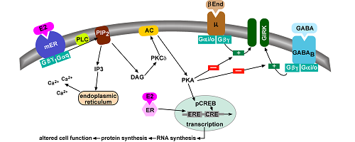 In collaboration with Drs. Oline Ronnekleiv and Tom Scanlan in the Department, we developed a novel non-steroidal compound, STX that mimics the rapid membrane actions of estradiol in hypothalamic neurons (Figure 1). We discovered that STX and estradiol act directly on these neurons via a G protein-coupled receptor to alter their activity. This unique membrane-associated estrogen receptor is Gq-coupled to activation of a phospholipase C-protein kinase C-protein kinase A pathway leading to desensitization of μ-opioid and GABAB receptors in POMC neurons (Figure 2), but sensitization of these Gαi,o-coupled receptors in NPY/AgRP neurons. We use two different experimental models. One model is the female guinea pig whose reproductive cycle mimics that of the human and therefore is ideal for doing whole-animal experiments (see below). Another model is the transgenic female mouse in which we can target POMC-Cre and NPY/AgRP-Cre (cells express green fluorescence protein) for whole cell recording and also deliver viral vectors to express channel-rhodopsin for elucidating downstream synaptic targets that are responsive to gonadal and metabolic hormones.