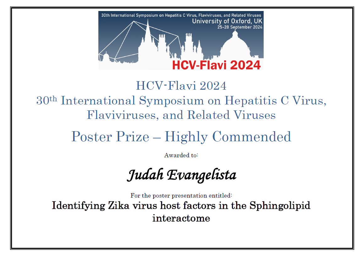 Judah Evangelista, Postdoctoral Scholar in the Schultz (Chemical Physiology Biochemistry, CPB) and Tafesse (Molecular Microbiology and Immunology, MMI) lab, received a Highly Commended Poster award at the recent 30th International Symposium on Hepatitis C virus, Flaviviruses, and related Viruses (HCV-Flavi) taking place in Oxford, UK. The experiments described in his poster, entitled ‘Searching for Zika Virus Host Factors in the Sphingolipid Interactome’, center around identifying the host proteins and lipids that viruses rely on to support productive infection of our cells. This work comes from a collaborative effort between the Schultz (CPB) and Tafesse (MMI) labs employing lipid probes – custom chemically-modified lipids that can be labeled and tracked in living cells – to identify proteins that interact with signaling lipids that are dysregulated in infected cells. In his postdoctoral work, Judah used CRISPR genetic screening in model liver cells to determine which of these proteins may make cells more susceptible or resistant to Zika infection, providing several new leads for defining the cellular pathways involved in infection.