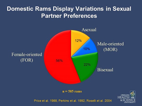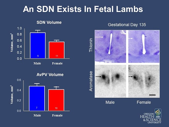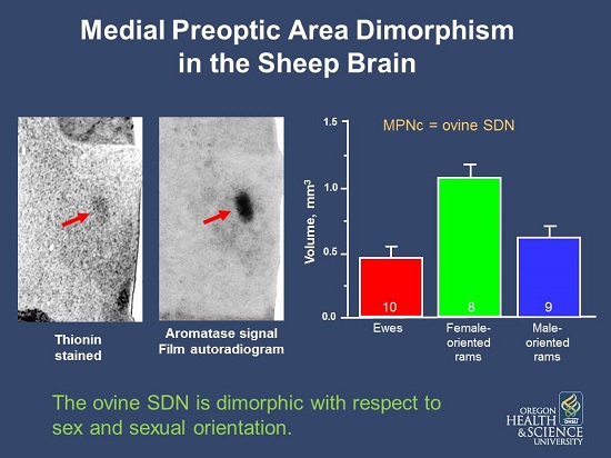 My laboratory discovered a sex difference in part of the sheep brain called that's known to control sexual behaviors. The difference consists of the size of a cluster of neurons in the preoptic area, which we named the ovine sexually dimorphic nucleus or oSDN. On average the oSDN is 2 times larger in rams than in ewes and expresses high levels of the enzyme aromatase. Approximately 8% of adult rams prefer to mount other rams instead of ewes, and the oSDN in these rams is smaller than in rams that prefer females; more similar to the volume of the oSDN in ewes. The sex difference in oSDN volume is present before sheep are born and controlled by hormone exposure during a critical period in fetal development. Testosterone produced by the fetal testis is responsible for the sex difference in oSDN volume. Thus, it seems plausible to suggest that natural variations in testosterone production and/or disruptions in its actions may reduce the volume of the oSDN and constitute a biological mechanism that predisposes rams to be acquire same-sex attractions. Our studies are exploring this possibility by systematically studying the processes that control sex-specific oSDN development in sheep.