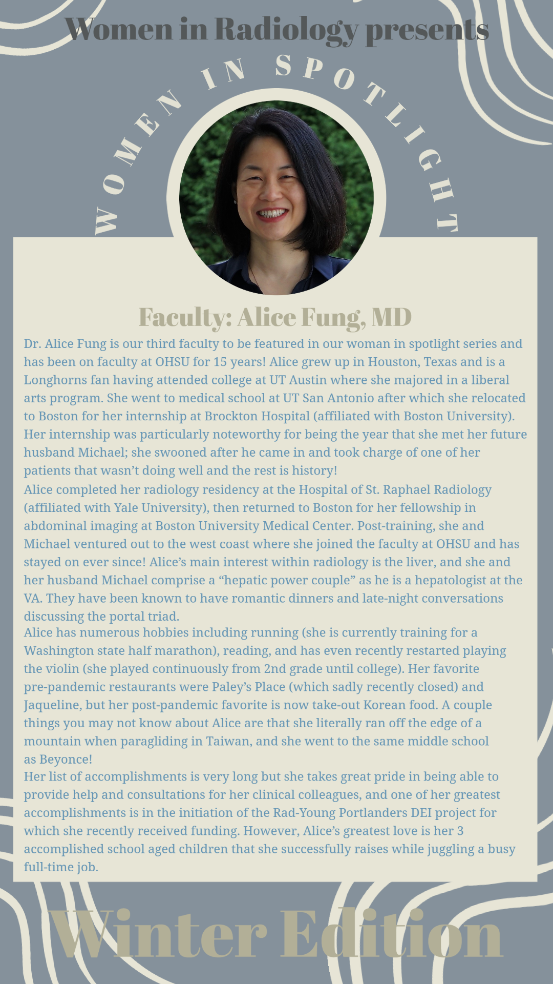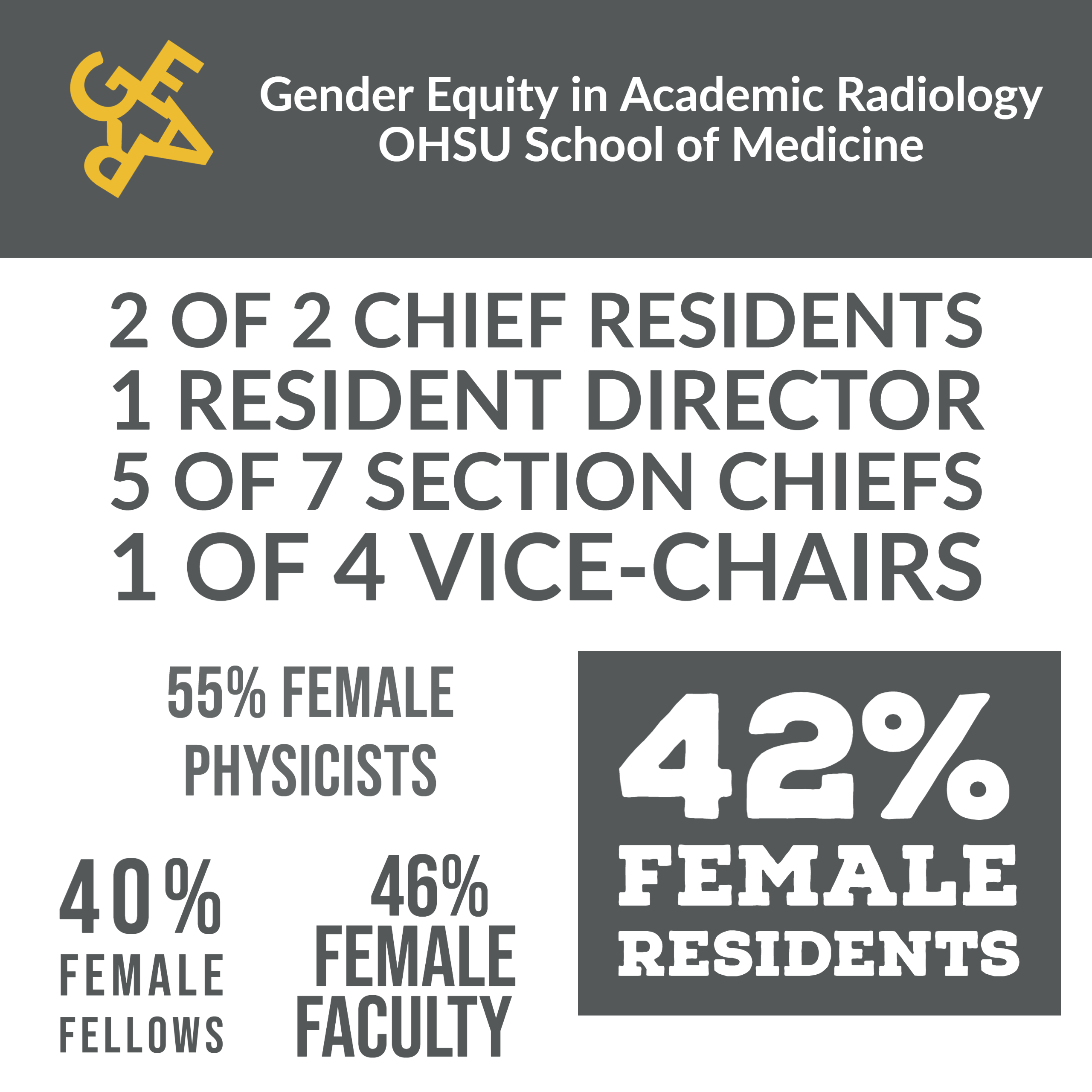 Within the Departments of Diagnostic Radiology and Interventional Radiology at OHSU, our goal is to eliminate gender disparities such that those identifying as women and gender diverse individuals have opportunities equal to that of their male colleagues at any level, have the voice and ability to speak up about inequalities, and the ability to advance their careers and assume leadership positions without bias. OHSU Radiology regards the matter of inequality seriously.