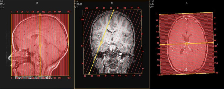 Orbits Only Coronal Coverage: Anterior margin of globe to anterior surface of pons, perpendicular to axis of the orbital segment of the optic nerves.