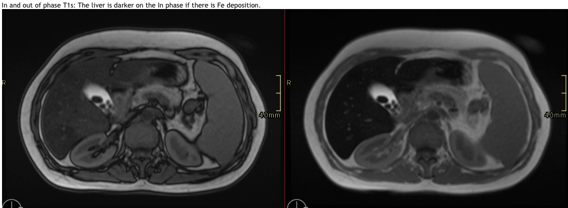 In and out of phase T1s: The liver is darker on the In phase if there is Fe deposition.