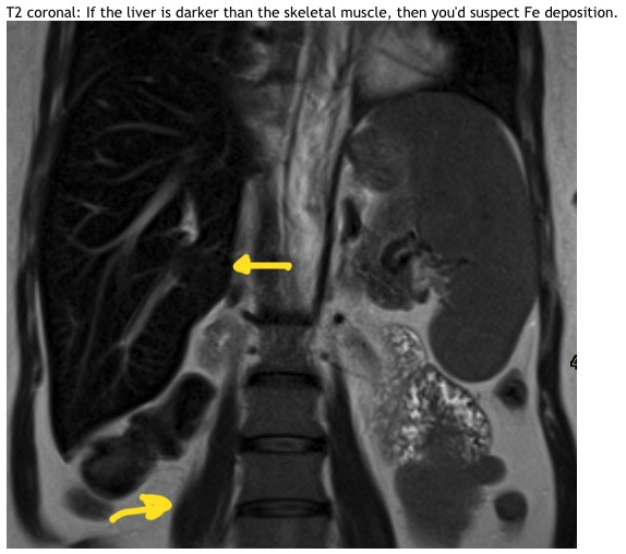 T2 coronal: If the liver is darker than the skeletal muscle, then you'd suspect Fe deposition.