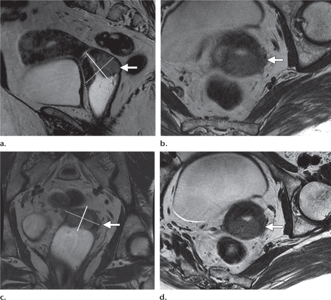 (a) Sag T2: mass in the posterior cervical lip (arrow) and the acquisition plane (dashed line) of oblique axial images, which were obtained perpendicular to the long axis of the cervix (solid line).