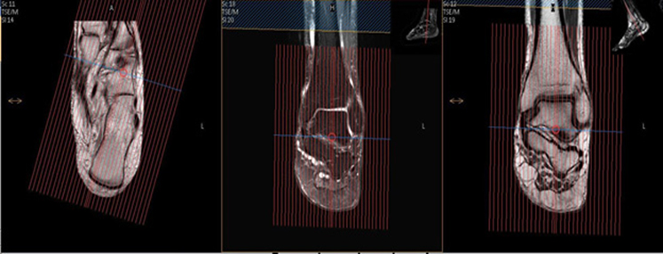 | SAG | T1 | TSE | 3mm | 0.3mm | None | 15cm | Angle to Calcaneus |