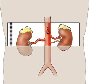 • Angled over renal cortices on transverse and coronal planes.