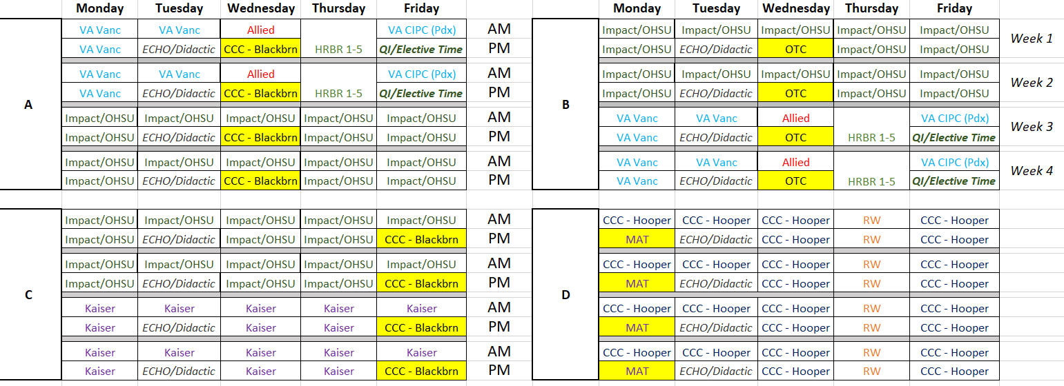 Orange highlighted cells represent quality improvement and administrative time. Yellow highlighted cells represent continuity clinics. These will be assigned by the program director upon matriculation.