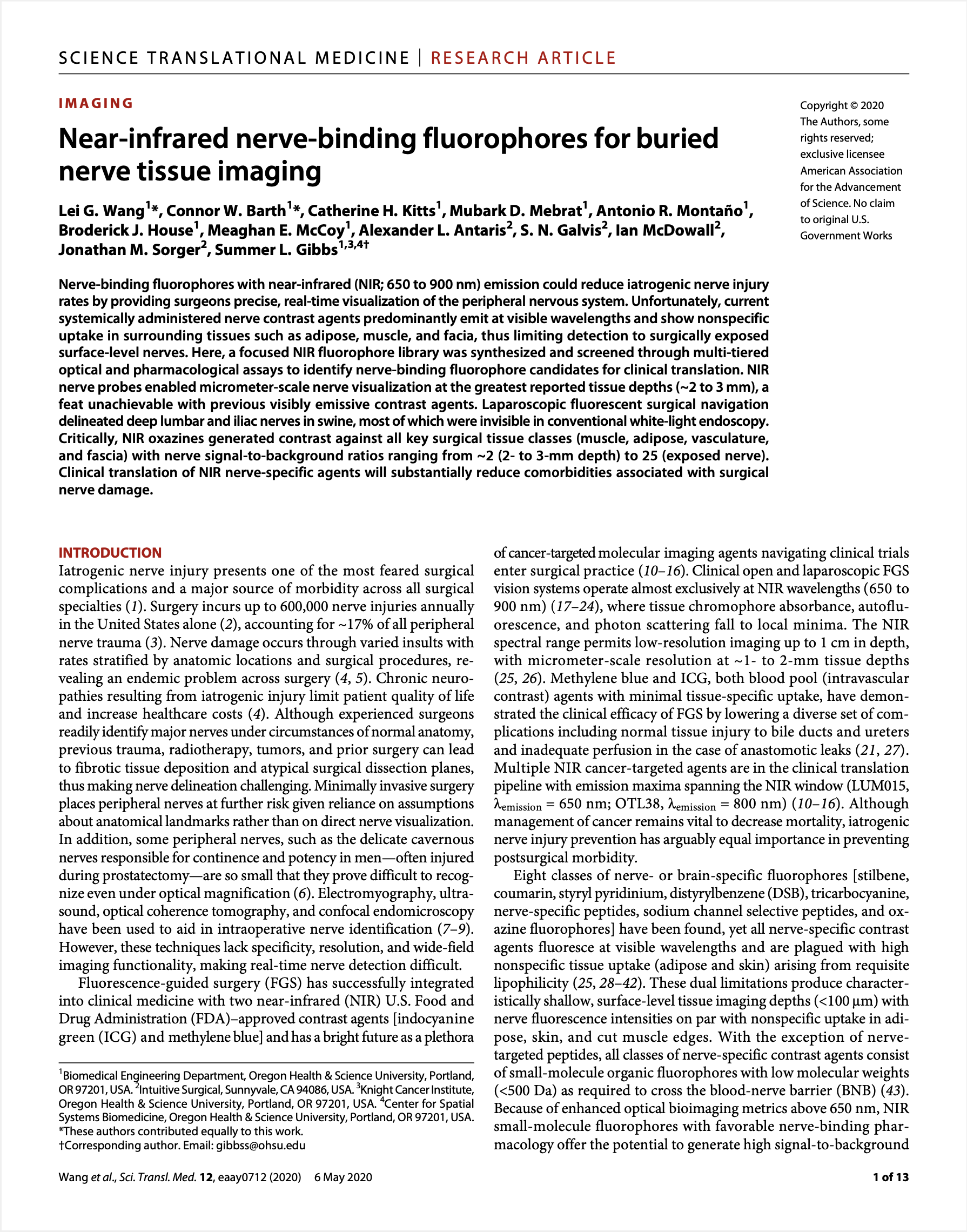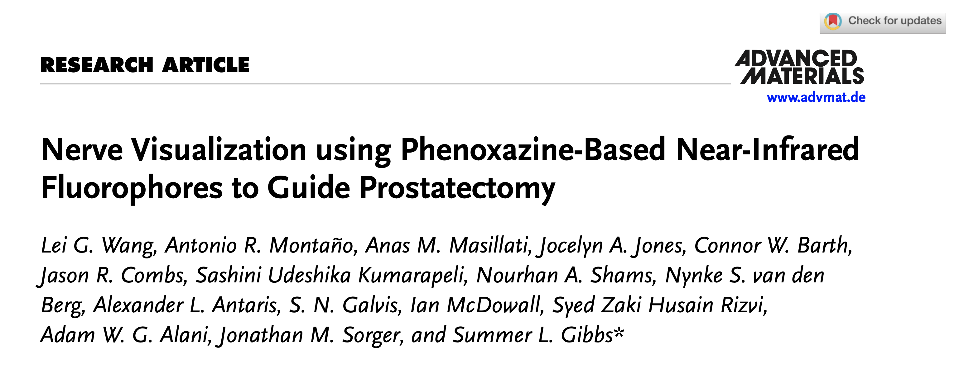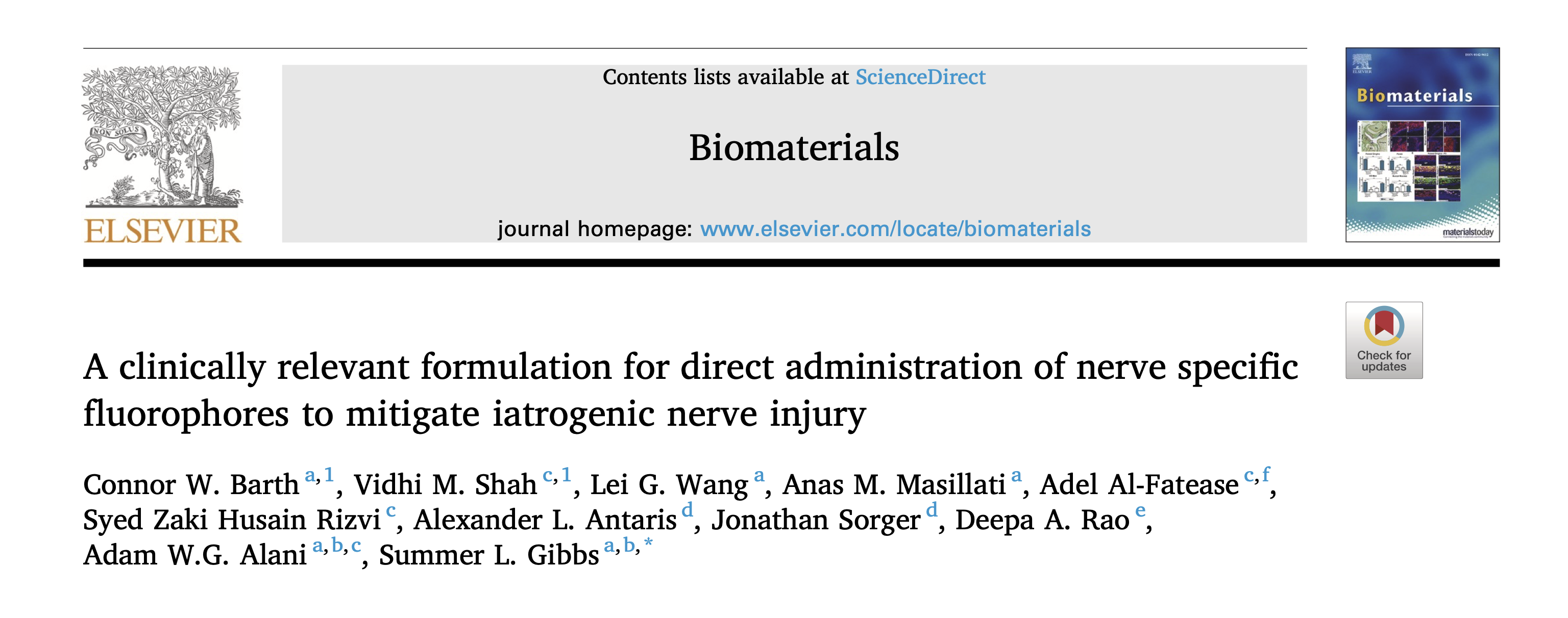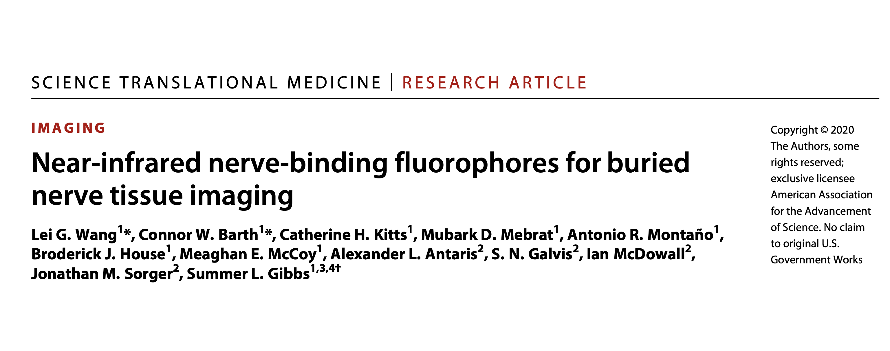 Feb 2025 - Antonio’s paper, titled “Matrix-designed bright near-infrared fluorophores for precision peripheral nerve imaging” has been published at Biomaterials. In this work, we present a unique matrix-designed approach for developing NIR nerve-specific contrast agents, emphasizing nerve specificity, sensitivity, safety, and compatibility with existing clinical infrastructure. Read more.